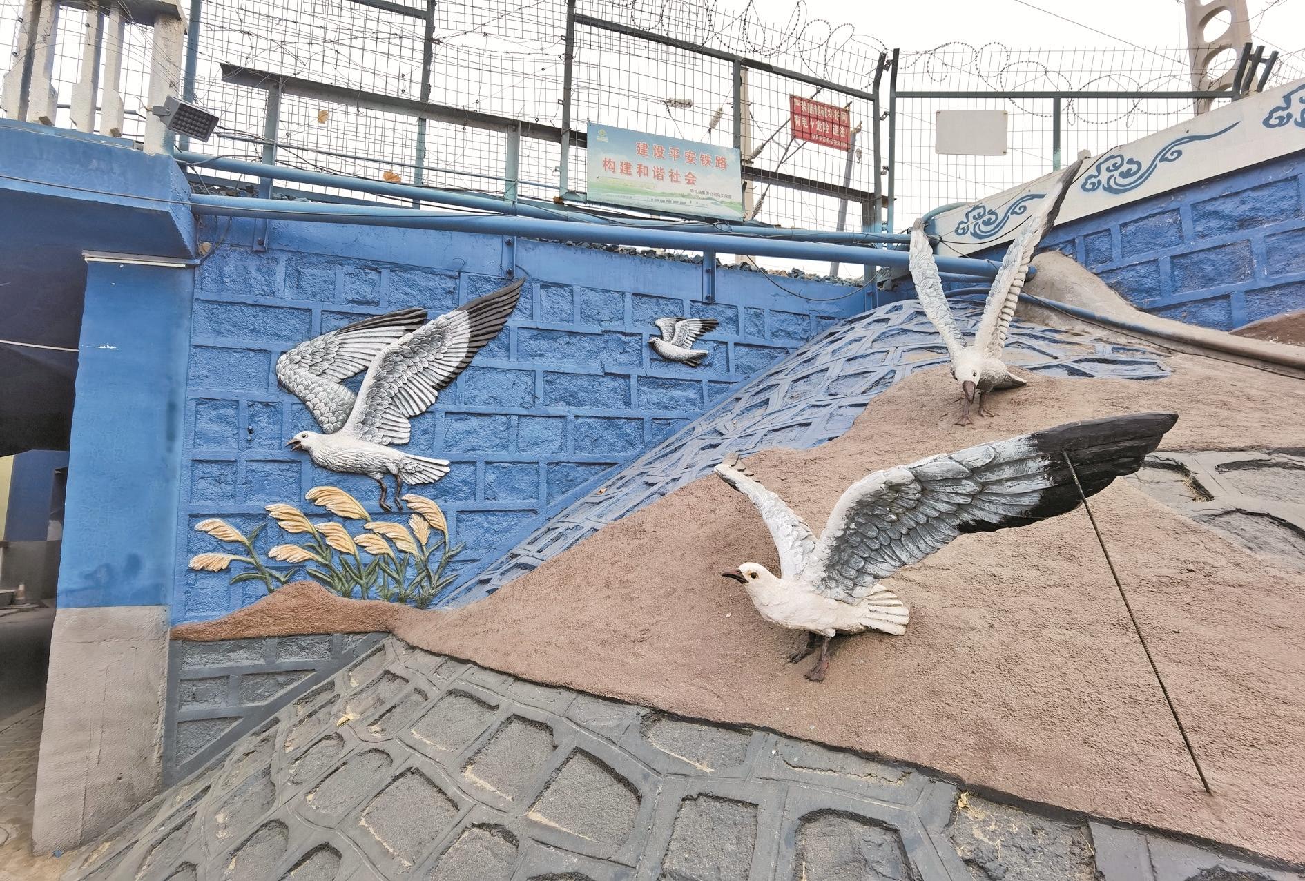 海勃湾区学府东桥下的桥体两侧,一幅幅以雕塑形式展现的作品让人目不暇接。驾车向西一出桥洞,桥下两侧护坡上形态各异的泥塑红嘴鸥“漫天飞舞”,曾经灰扑扑的毛石墙面被描绘得五彩斑斓:蓝天、白云、沙漠、湖泊,栩栩如生的红嘴鸥翱翔其间,它们或展翅高飞,或恩爱嬉戏,或捕食喂养,一二独立,三五成群,构成了一幅生态乌海的美丽画卷。站在桥边,仿佛能听到鸥鸟此起彼伏地鸣叫。