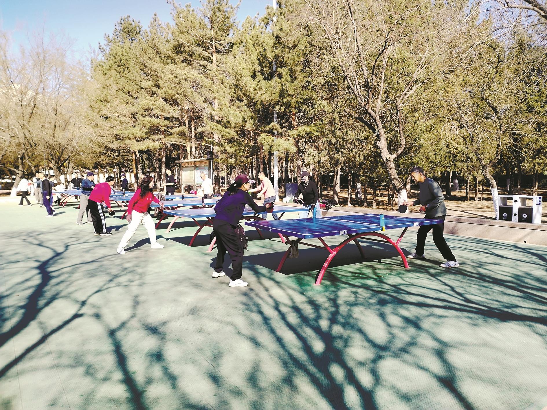 时下春光正好,越来越多的市民走出家门锻炼身体,我市各公园、绿地逐渐热闹起来。图为市民在市人民公园打乒乓球。