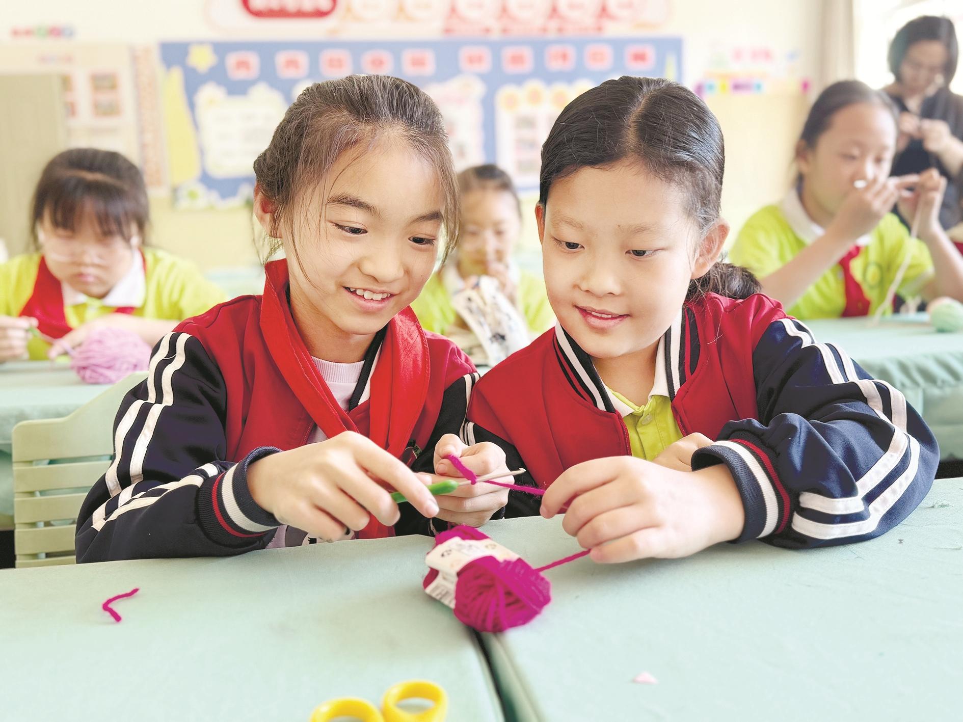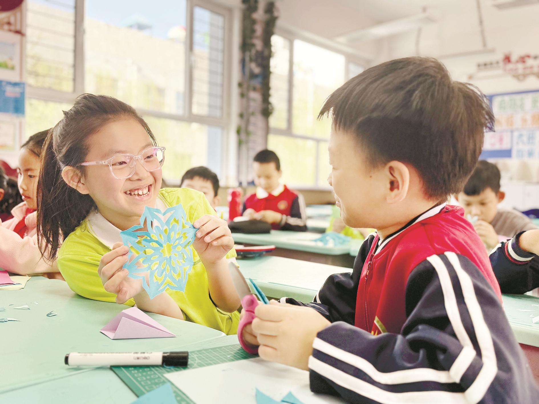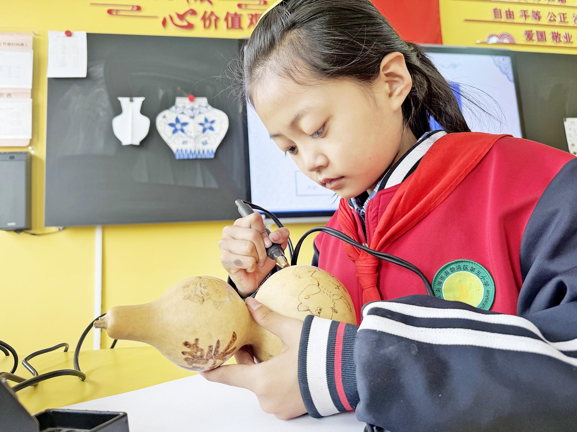 “为落实国家‘双减’政策,丰富学生校园文化生活,尊重学生个性发展,学校以‘面向全体、彰显个性、培养兴趣’为宗旨,本学期共开设无人机、啦啦操、棋类等57个童心社团,其中非遗项目10个,孩子们逐渐学会了剪纸和刺绣等技艺,在孩子们的心中播下了热爱和传承非物质文化遗产的种子。”海勃湾区第五小学副校长吉亚利说。