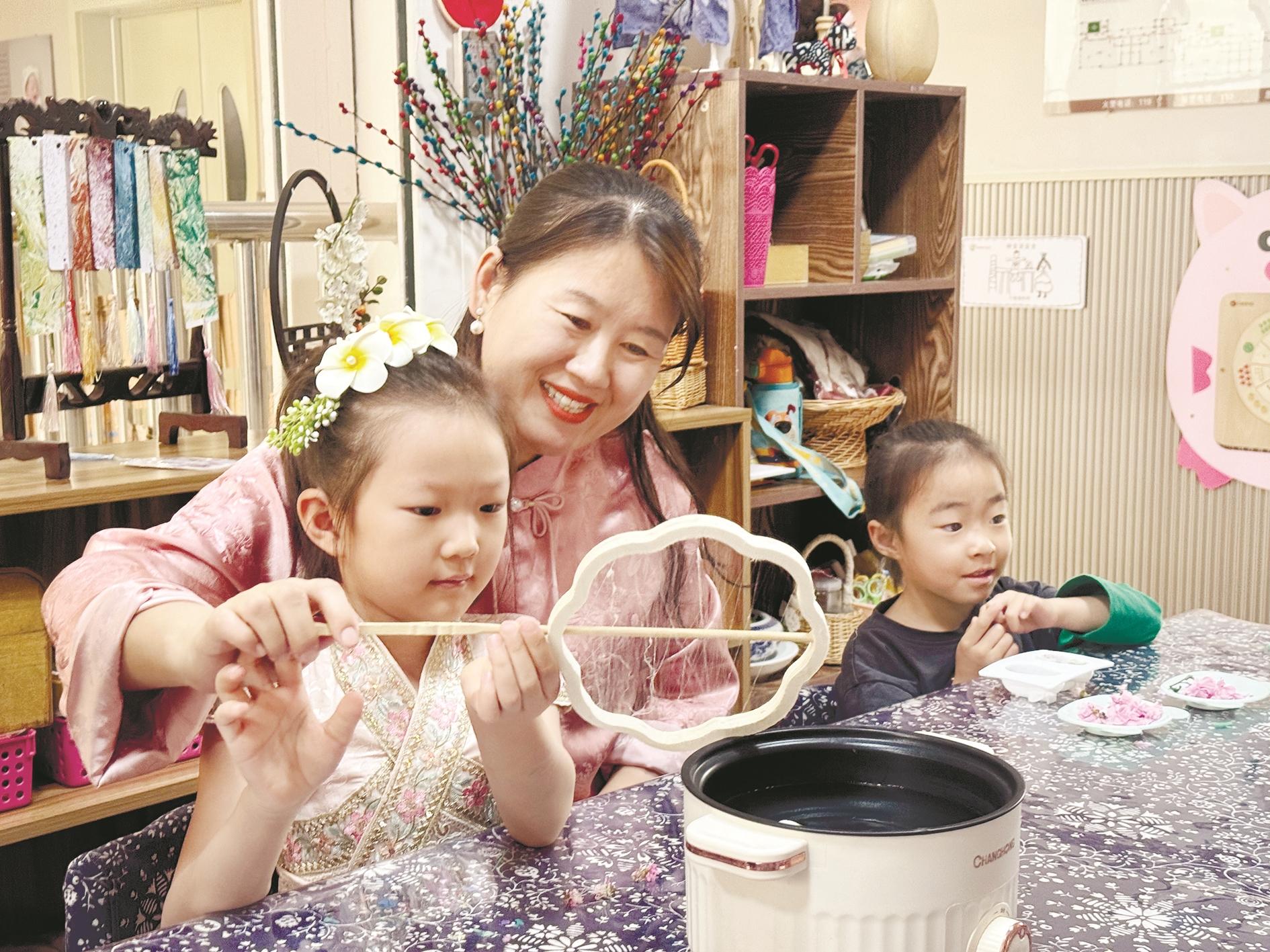 近年来,为弘扬中华优秀传统文化,丰富校园文化生活,海勃湾区第八幼儿园为幼儿打造非物质文化遗产功能厅,充分利用丰富的教育资源,引导幼儿感受和体验非物质文化遗产的内涵与精髓,增强幼儿了解和传承非遗的意识。图为幼儿在非物质文化遗产功能厅体验非遗项目。 (张靖爽 摄)