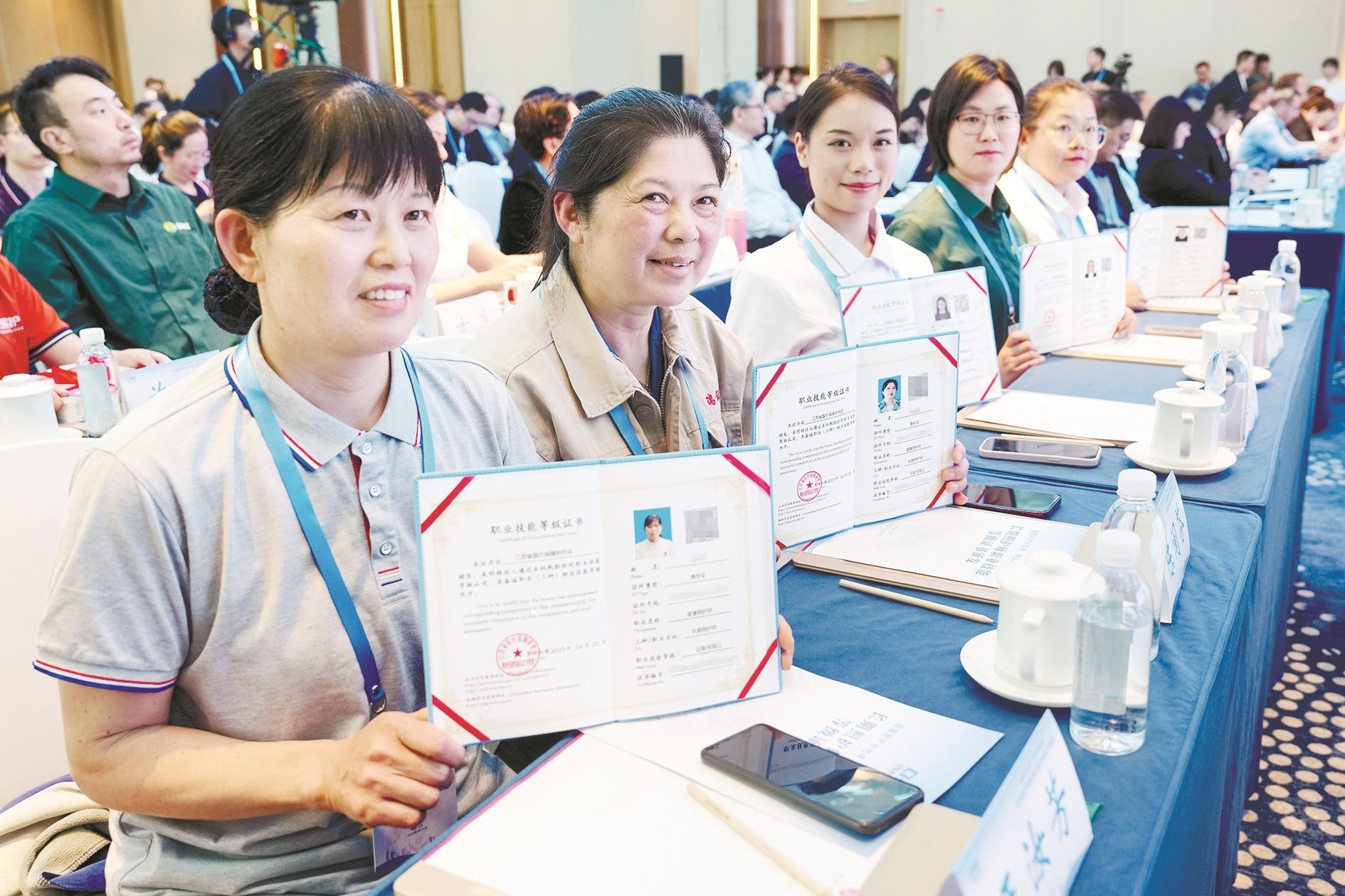 4月28日,长期照护师代表在活动中展示证书。