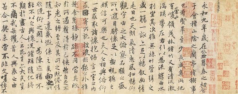 可惜的是,《兰亭集序》的真迹已无,目前流传于世的墨迹本,多为唐人的临本或摹本。其中,比较著名的有冯承素版、褚遂良版等。冯承素版“神龙本”临摹得最忠于原作,是公认的仿真度最高、风格最接近原作的版本,也是目前用得最多、最为大众所熟悉的版本。此版为双钩填墨本,飞白处似有酒渍渗透,让人疑心那根本不是墨,而是从兰亭流觞中舀出的春水。褚遂良临本上有米芾的题跋诗,故亦称“米芾诗题本”。此版以临写为主,辅以勾描,因此书写较为流畅,体现了一定的书法功力。无论何种版本,那些游走的墨线始终延续着王羲之的风姿,恰似春日里半开的海棠花,在闲散和严谨之间找到平衡,绽放得恰到好处。