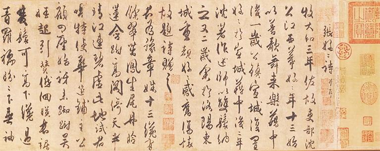 《张好好诗卷》上钤印累累,印证了其流传千年的身世。这件作品历经劫火,从宋徽宗宣和内府到清宫《石渠宝笈》,从溥仪携带出紫禁城到张伯驹倾囊购藏,使之“永存吾土”,最终在故宫博物院重获新生。在流转中,卷上的霉斑与裂痕如同岁月镌刻的“春痕”,赋予了它更多历史质感。 (转载自《海南日报》)