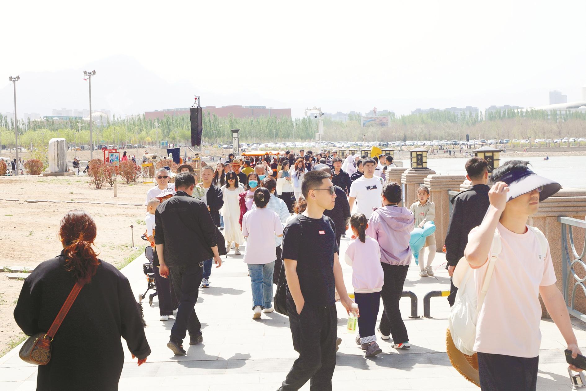 “五一”假期,乌海湖休闲度假旅游区以独特的自然风光、丰富的水上体验项目,吸引了大量游客观光游玩。图为乌海湖一号码头游人如织、热闹异常。 (赵政宇 摄)