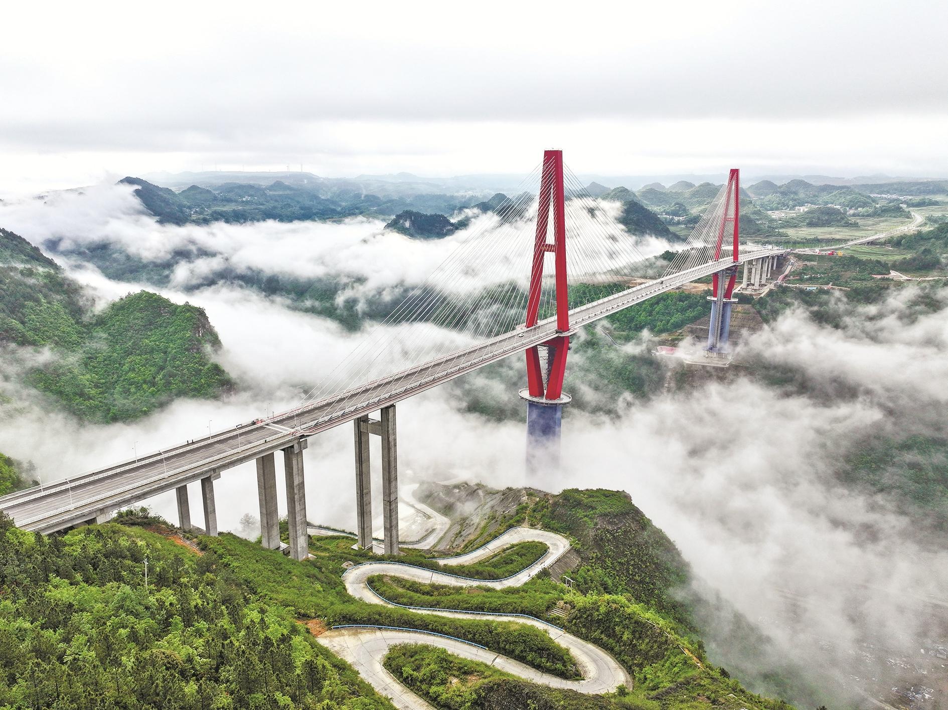 当日,一场春雨过后,贵州省龙里县的龙里河大桥周边出现云海景观,晨曦中的大桥仿佛飞架于云端之上,蔚为壮观。龙里河大桥全长1260米,主桥及塔柱设计有观光旅游玻璃栈道、全景观光电梯等旅游设施,是贵州探索“桥旅融合”打造的新“网红”景点。