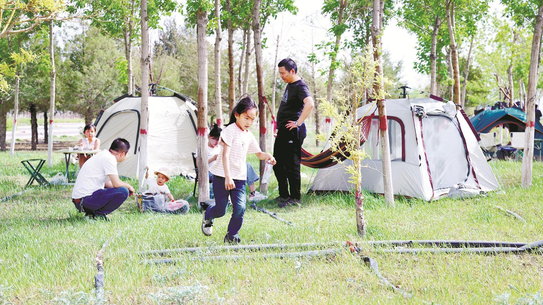 “五一”假期,我市的露营基地内人潮涌动,帐篷林立。人们围坐在一起,或烧烤谈天,或交流互动,享受着远离城市喧嚣、投身自然怀抱的乐趣。图为游客在乌达区漠海山境露营基地享受假日生活。(赵政宇 摄)