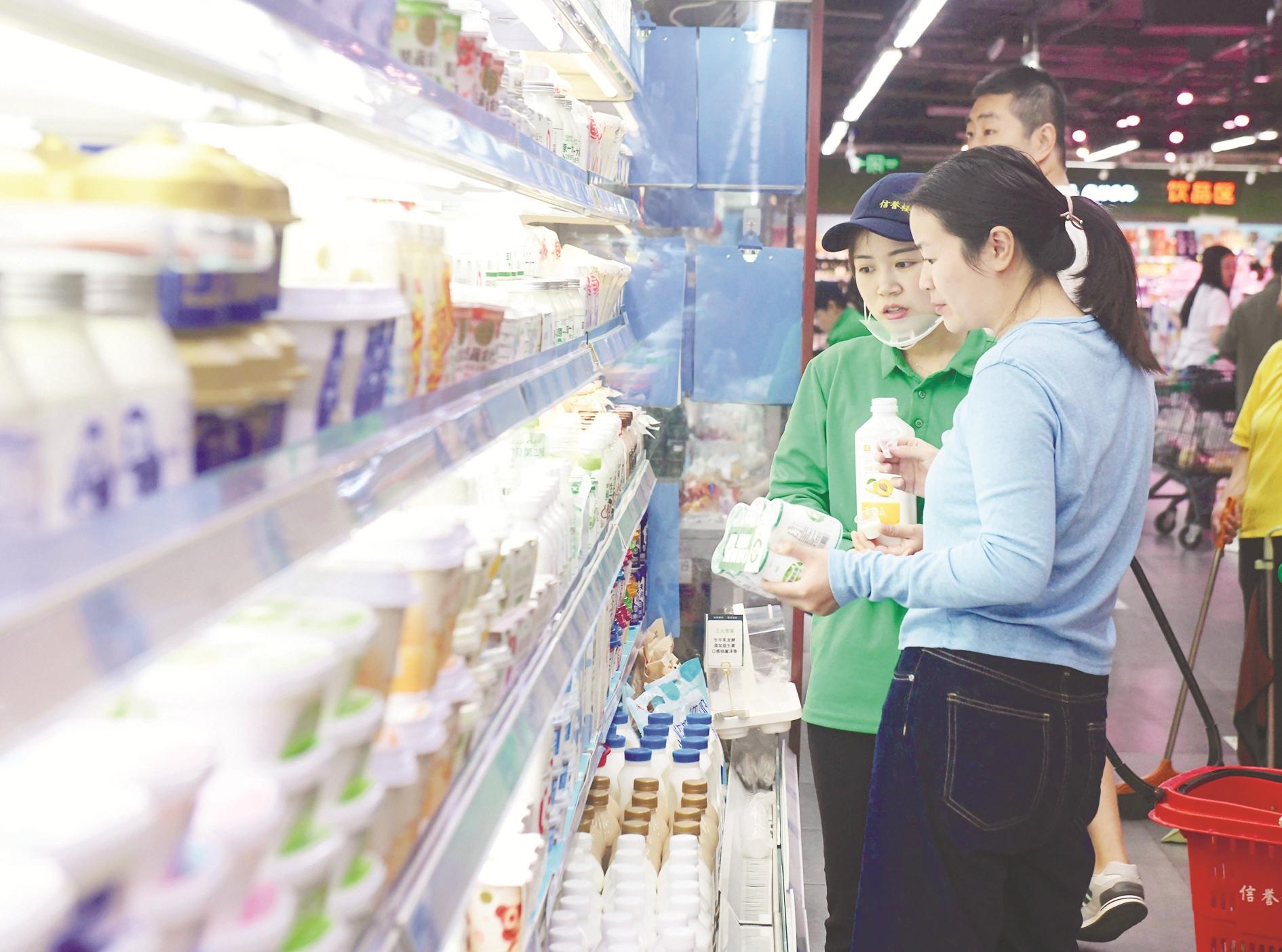 5月5日,消费者在河北石家庄新乐市一家超市选购乳制品。2025年“五一”假期,全国消费市场繁荣活跃。据商务部商务大数据监测,假期全国重点零售和餐饮企业销售额同比增长6.3%。其中,以旧换新备受欢迎,服务消费持续升温,餐饮文旅市场红火。
