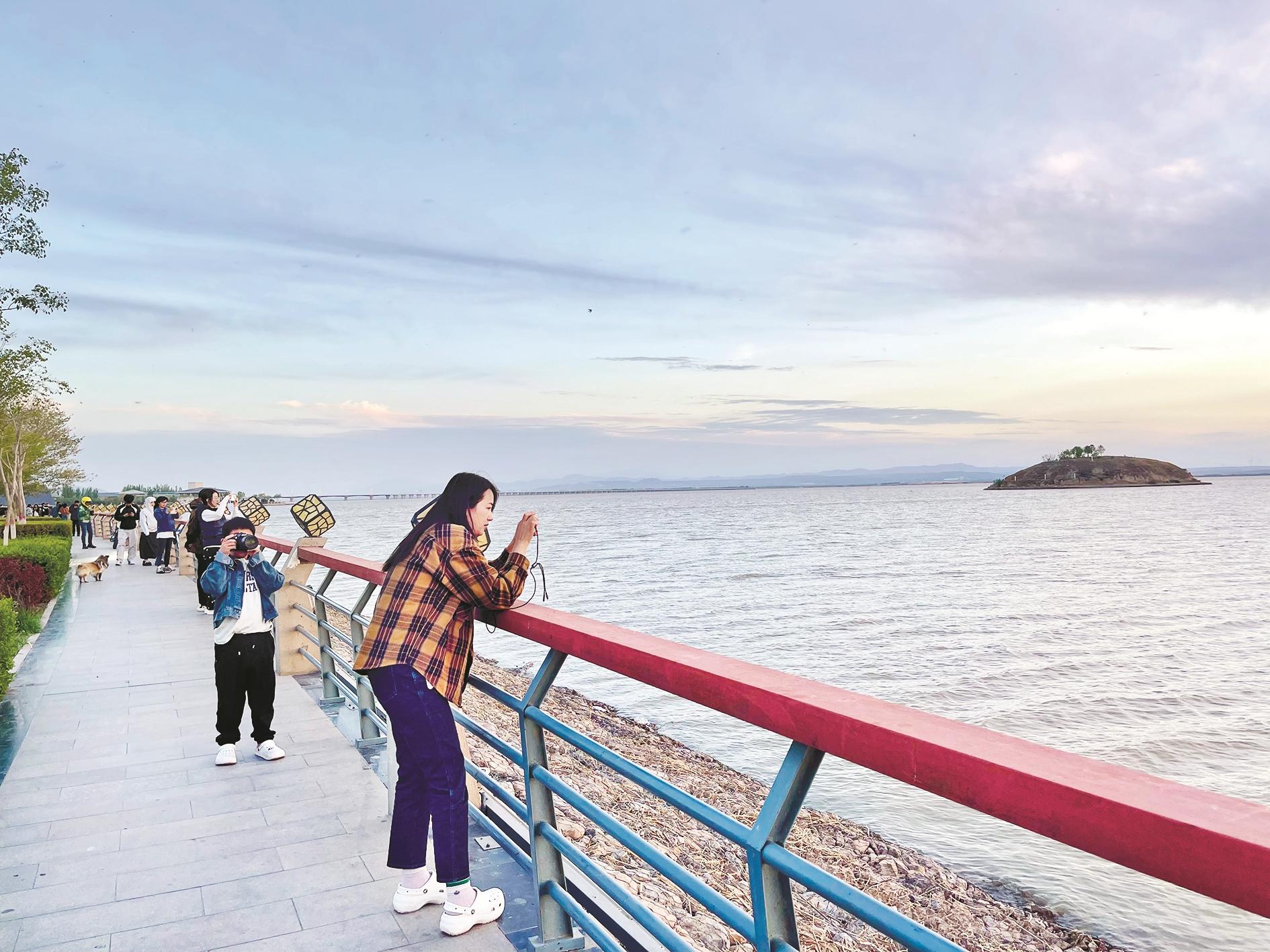 5月6日傍晚,乌海湖一号码头微风习习、夕阳浸染,丝丝金辉潋滟。游客驻足湖畔,用镜头定格美景。