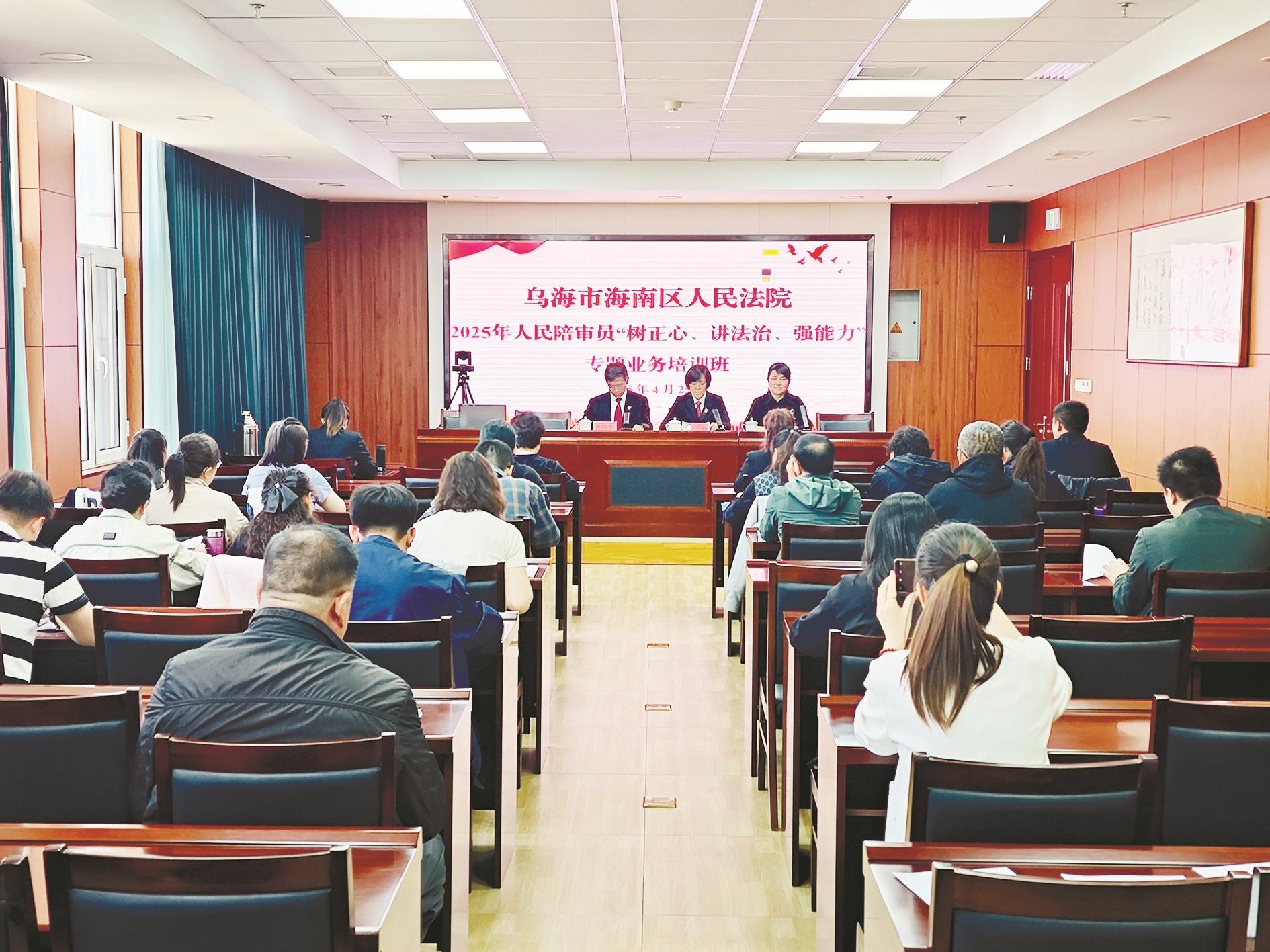 近日,海南区人民法院举办2025年度人民陪审员“树正心、讲法治、强能力”专题培训班。授课人员从刑事、民事、行政业务主责主业、庭审重点、廉政纪律等方面进行深入浅出的讲解,引导人民陪审员更好地履职尽责,依法、规范参与人民陪审工作。 (曹艺 摄)