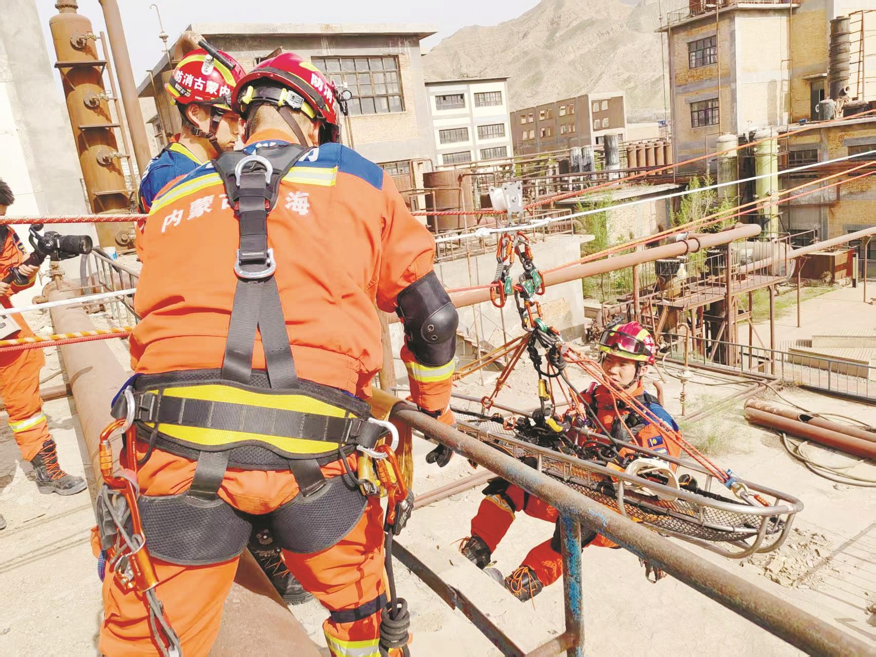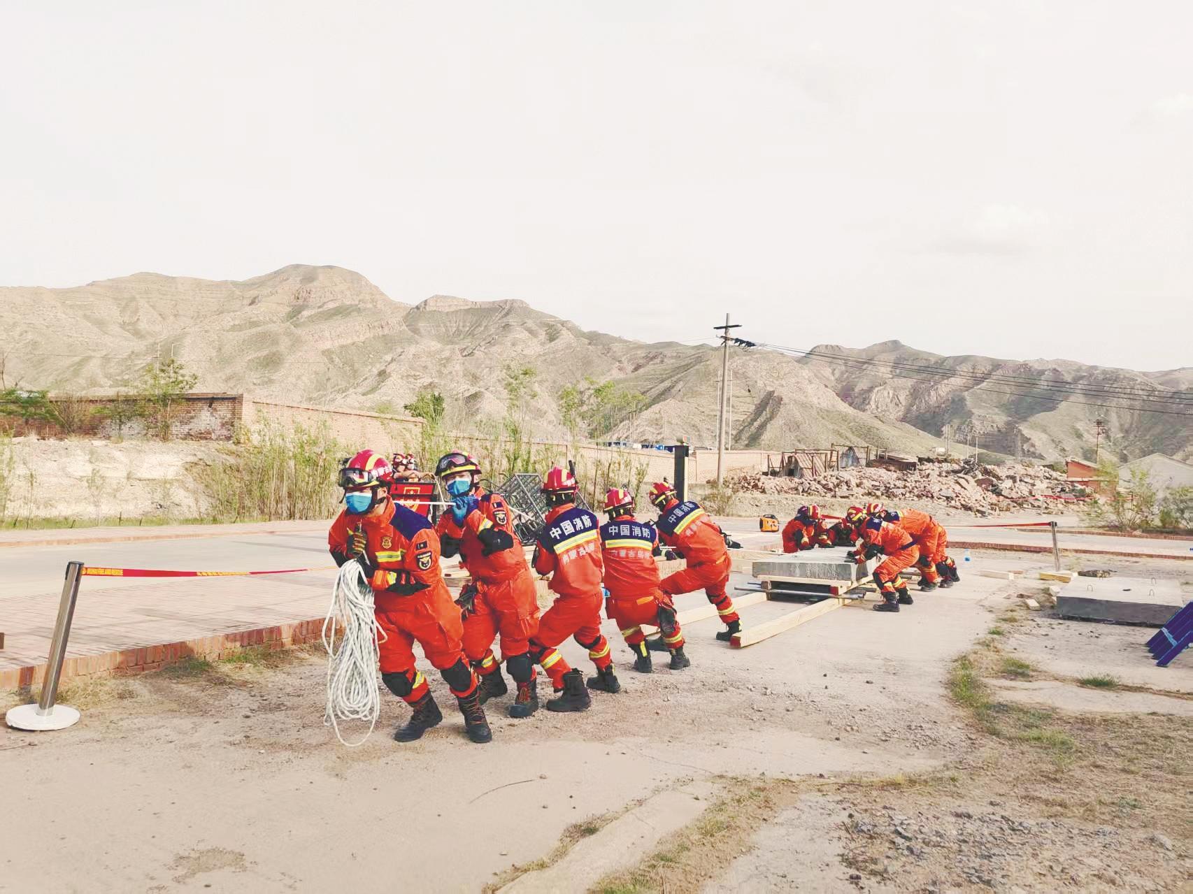是演练,也是实战。消防员们立即集结,穿着橙色抢险救援服,身背近20公斤重的72小时携行包,上车前往现场。途中受“地震”影响,道路“损毁”,消防员们在崎岖不平的戈壁沙漠路段徒步10公里,经过重重考验,最终抵达“地震中心”现场。