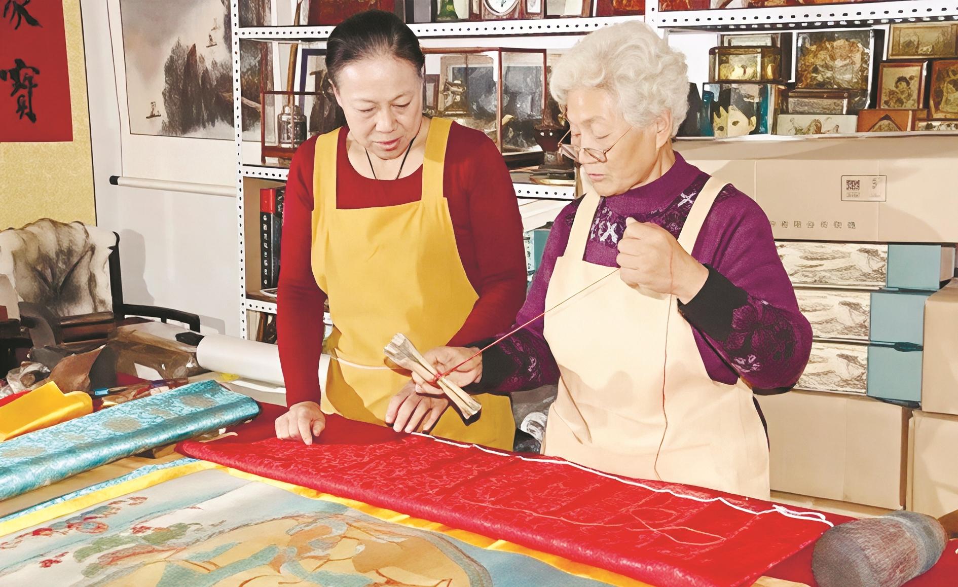 这项技艺的一代、二代、三代传承人均为清宫造办处唐卡装裱技师。许会英说:“这项技艺只传女儿,其实也是一种爱,为了让女儿能有一项生存的技能。”