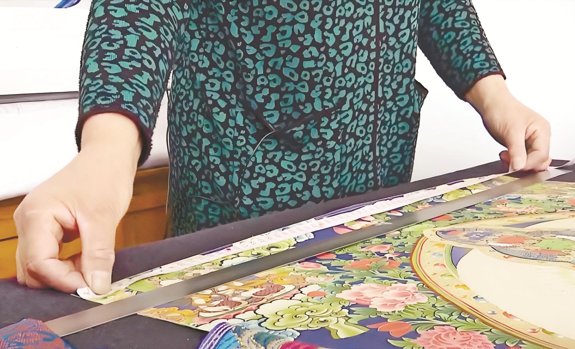 唐卡(清宫式)装裱过程,在清朝乾隆二十五年(1760年)基本固定下来。我市非遗传承人许会英说:“当时,唐卡的绘制在中正殿完成,画匠们在此精心创作。绘制完成后,唐卡便被送往造办处进行装裱。”造办处,这个专为皇家制造御用品的机构,汇聚了顶尖的手工艺人,他们以精湛技艺为唐卡赋予华丽庄重的外观。唐卡(清宫式)装裱工序极为繁杂,包含材料选配、量裁美龙、裁剪材料、褙衬材料、镶装缝合、裱褙后衬、安天地杆、装镶饰品、平整查验9大项工艺以及108道小工序,且全部手工完成。许会英说:“装裱材料选配要根据美龙的颜色、大小、图案等,巧妙搭配丝绸、锦缎、绫子等高档面料,为唐卡奠定视觉基调。”