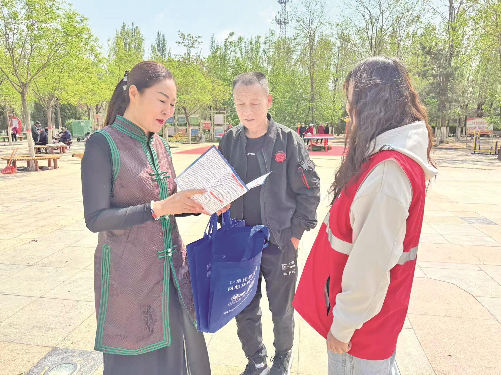近日,海勃湾区新华西街道滨水社区开展了《内蒙古自治区促进民族团结进步条例》主题宣传活动,向居民群众发放宣传手册,为现场居民群众介绍条例出台的意义、相关法律法规以及条例亮点等内容。 (毕晓敏 摄)