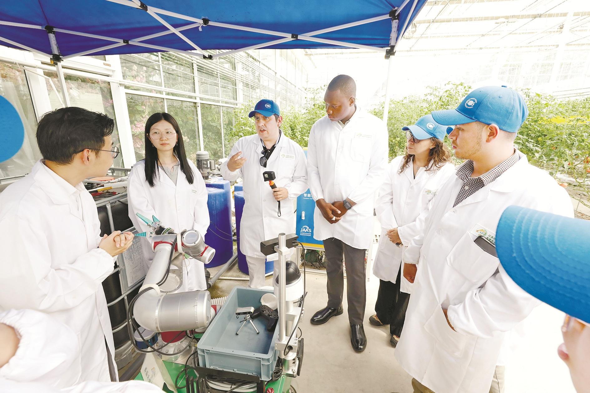 2024年5月22日,“中国—FAO南南合作拉丁美洲和加勒比地区农村生计改善和粮食体系转型能力建设活动”学员赴江苏省农业科学院开展交流,在江苏省农科院科研温室展示区的农业信息馆中,专家向学员介绍智慧农业研究团队自主研发的智能采摘机器人(番茄)。 新华社发(江苏省农业科学院供图)