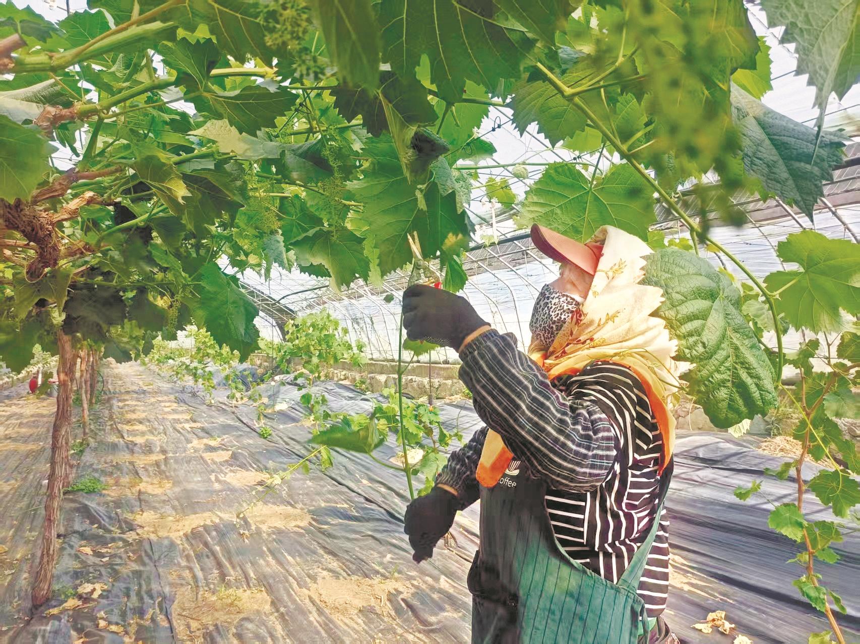 近日,在乌海市云飞农业种养科技有限公司的绿色智能设施葡萄示范基地内,工人正忙着对葡萄进行疏果、剪枝等田间管理。当前正值葡萄结果关键期,基地通过科学疏果、除草、施肥等措施,确保葡萄品质与产量,为丰收打下基础。 (刘春霞 摄)