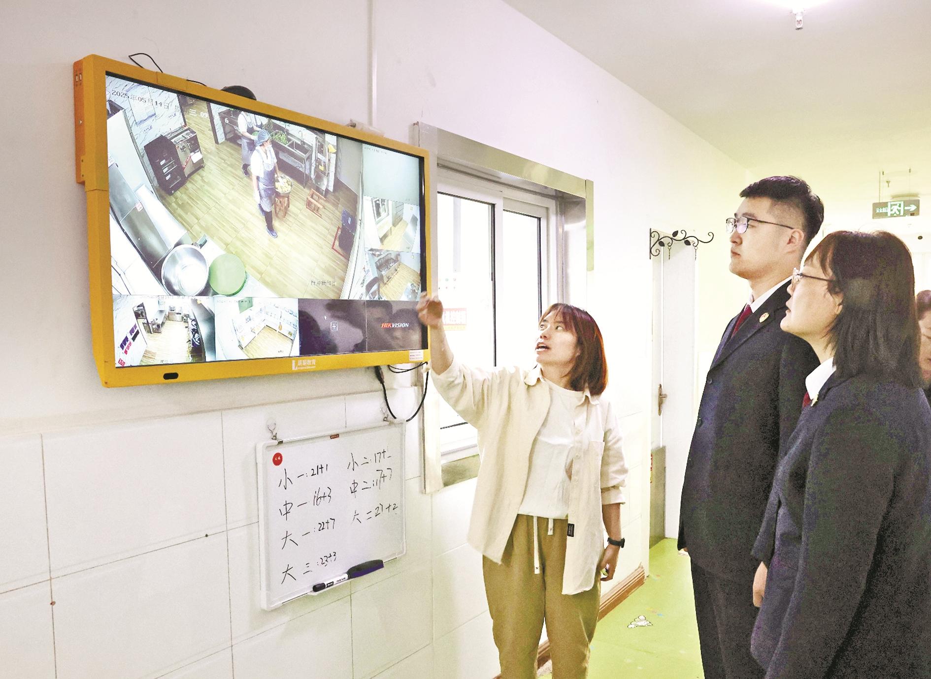 为营造安全、健康、放心的校园餐饮环境,5月14日,乌达区人民检察院联合乌达区市场监督管理局、乌达区教育局等部门对辖区幼儿园开展食品安全专项监督检查,对于发现的问题责令整改,切实消除食品安全风险隐患。图为工作人员通过监控视频查看厨房操作间情况。(王慧蓉 摄)