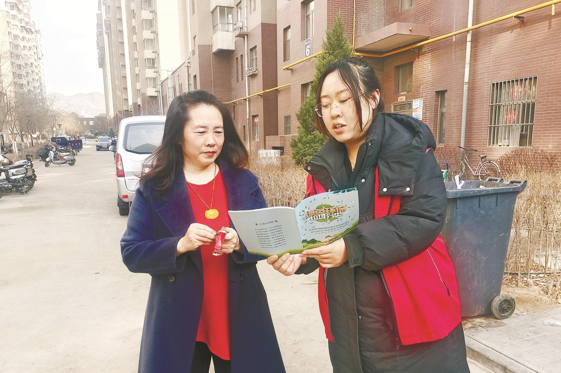 近日,海勃湾区新华街道新海社区开展“垃圾分类益处多 环境保护靠你我”宣传活动。社区志愿者、网格员通过走访商户住户、发放资料、现场讲解等形式,向辖区居民群众宣传垃圾分类的重要性,呼吁大家自觉养成垃圾分类的好习惯。 (黄建飞 摄)