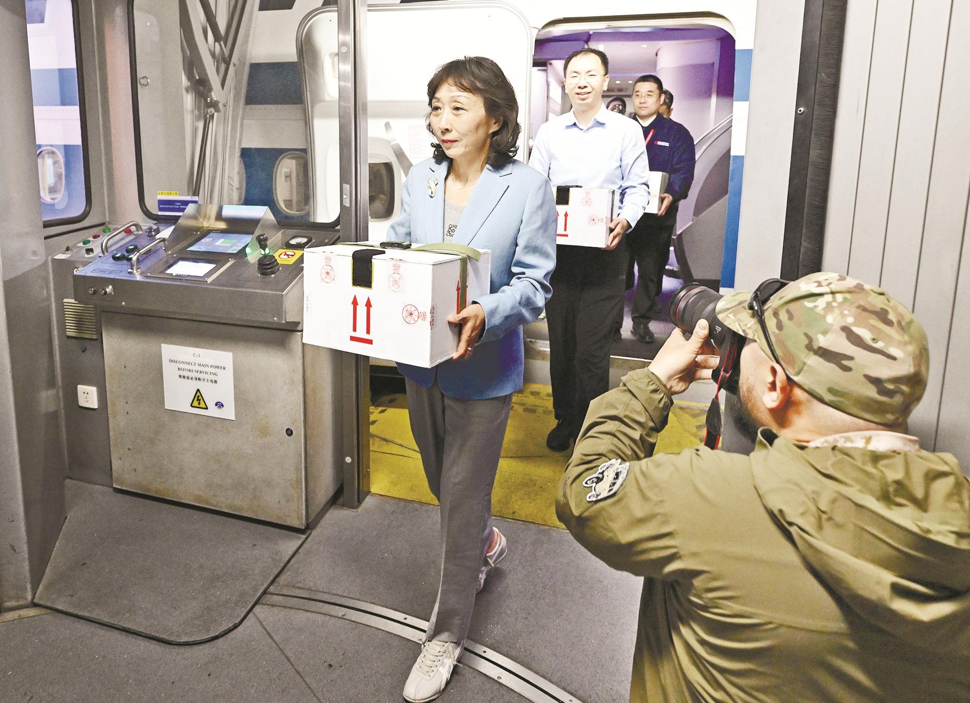 4时45分,准备妥当后,4名工作人员每人手捧一件文物包装箱,缓步离开机舱。文化和旅游部副部长、国家文物局局长饶权迎候在廊桥口,等待接收。