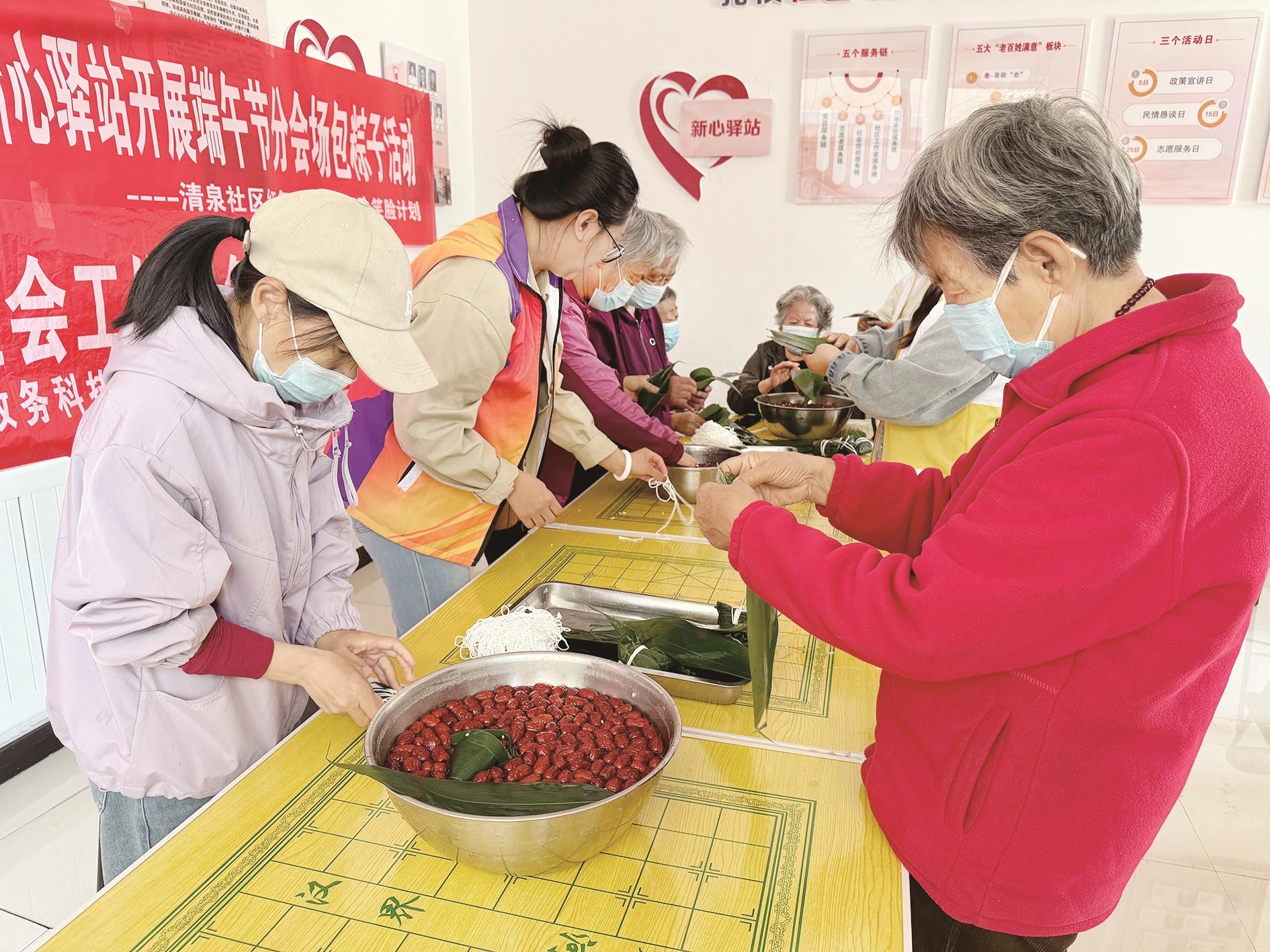 5月23日,海勃湾区新华街道清泉社区开展“巧手制皂承艾草 浓情裹粽度端午”主题活动,图为居民们一同包粽子、拉家常。 (段维娜 摄)