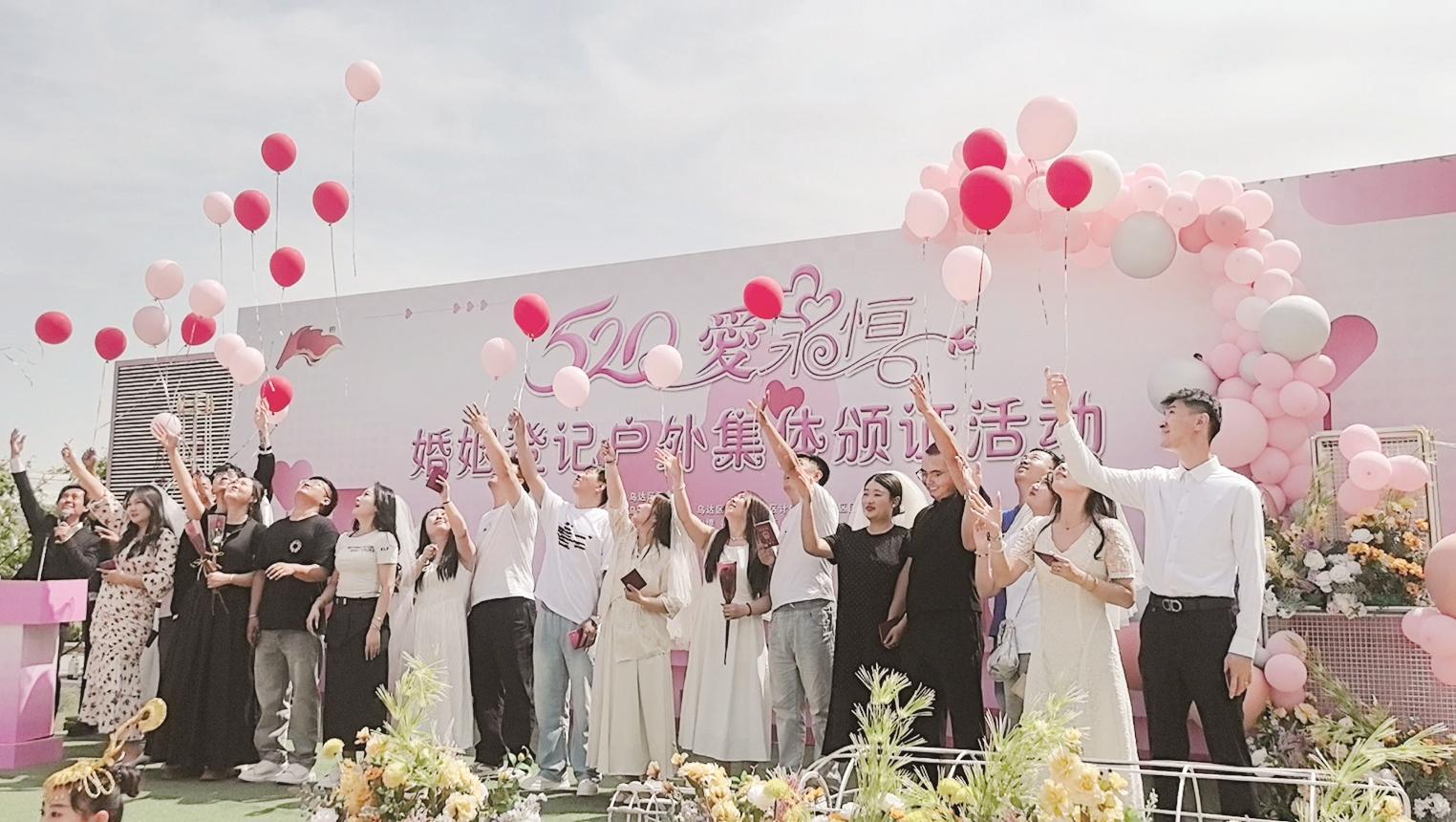 为满足新人“520”登记的美好心愿,乌达区民政局提前启动全流程服务保障机制:开启 520登记绿色通道,安排专人高效办理结婚登记手续;新人依次提交材料,完成信息录入、证件审核等流程,领取结婚证;工作人员为前10对领取证件的新人佩戴专属纪念胸贴;精心打造颁证场景,布置鲜花和彩带,邀请新人的朋友们到现场为他们送上祝福。