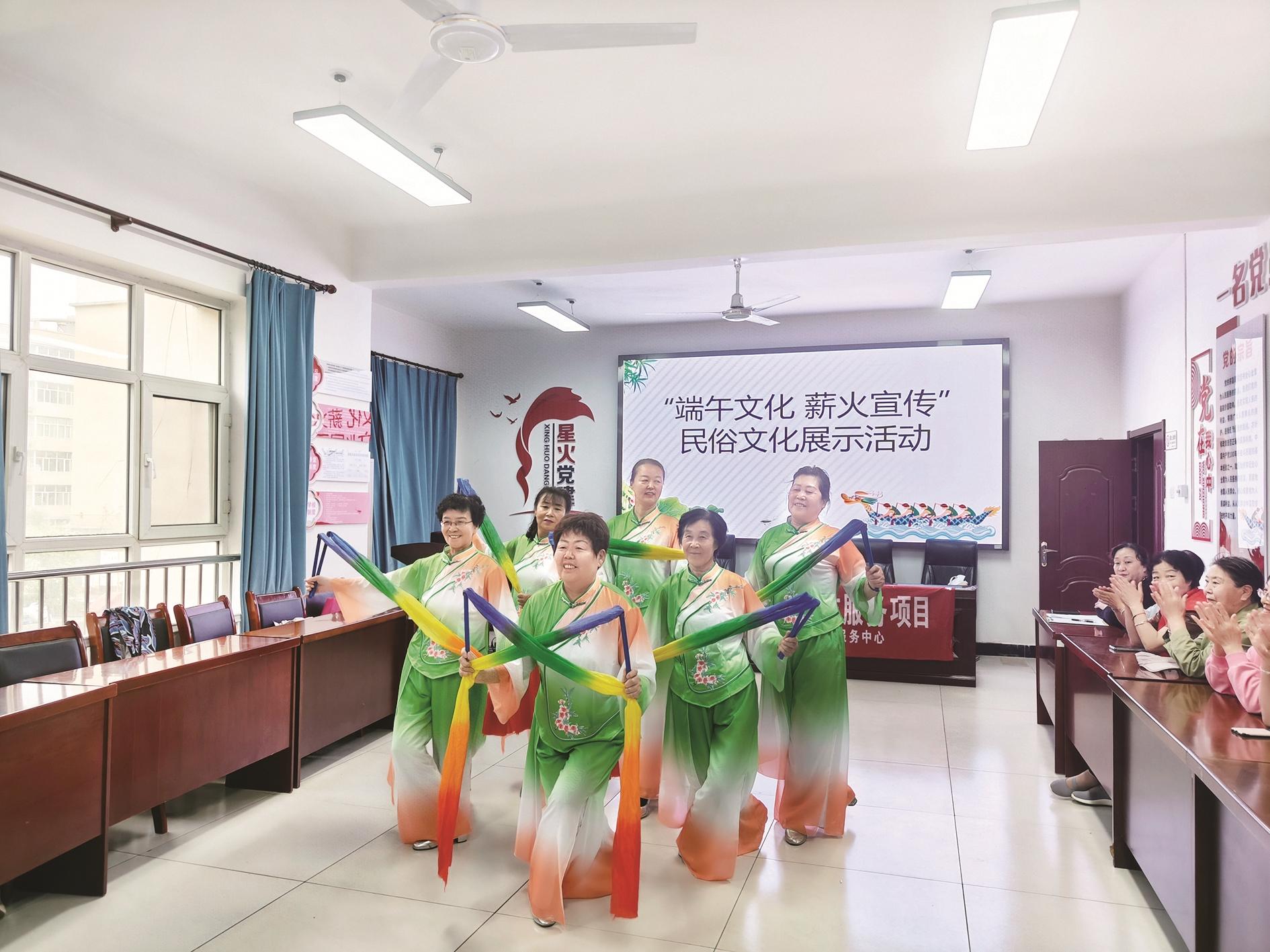 5月27日,海勃湾区新华街道康乐社区开展“粽香飘邻里 情暖端午时”第二届社区邻里节系列活动。居民们欢聚在一起,包粽子、搞展演,挖掘端午浓厚的文化内涵,增进了邻里感情,烘托了节日气氛。 (斯琴满都海 摄)
