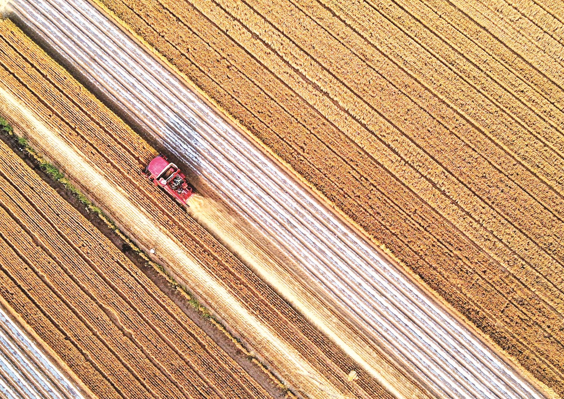 5月26日,农机手驾驶收割机在山东省临沂市平邑县地方镇田间收割小麦。