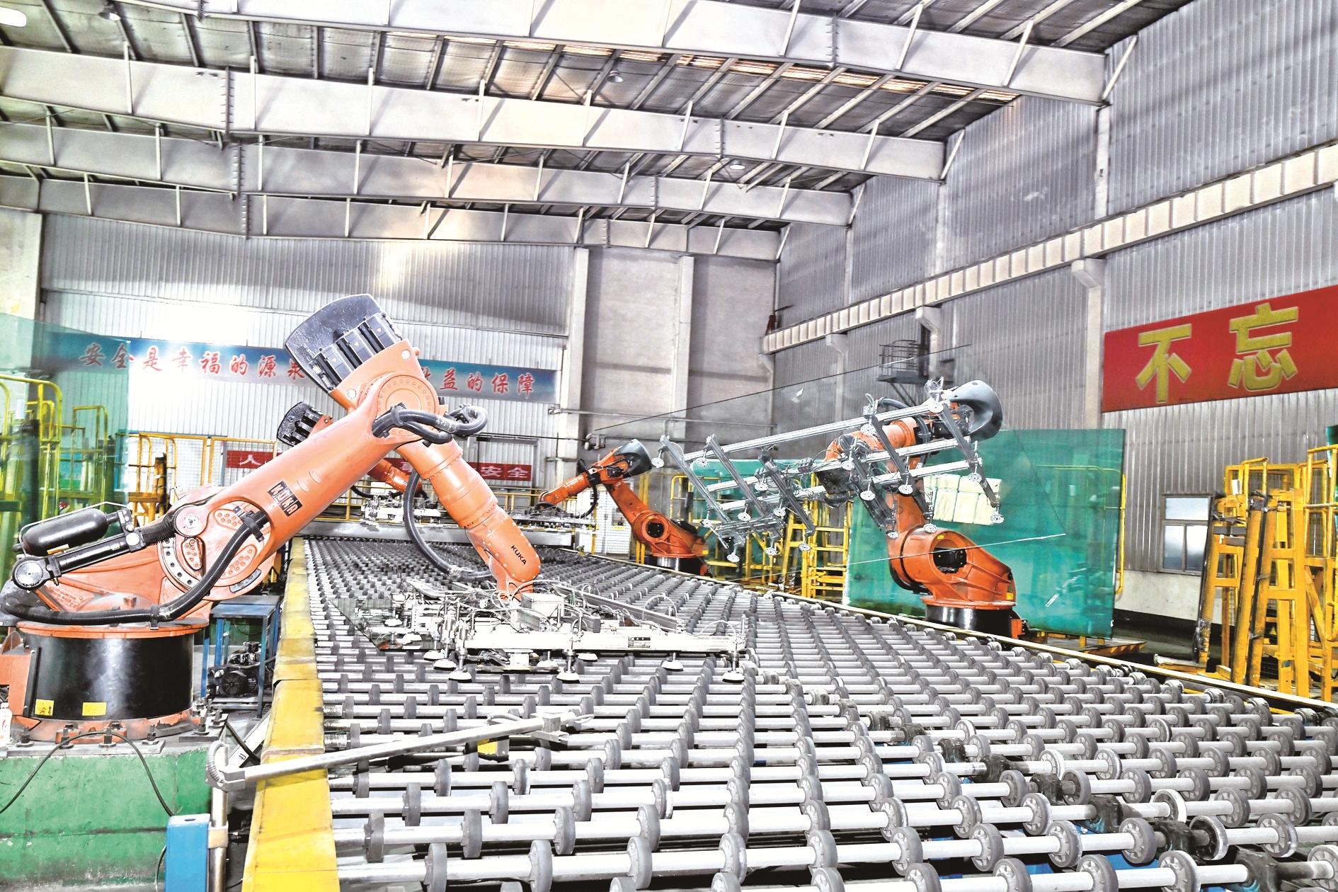 现乌海中玻特种玻璃有限责任公司自动化生产车间,内智能化机械臂精准地抓起玻璃并安全码垛。 (王超 摄)