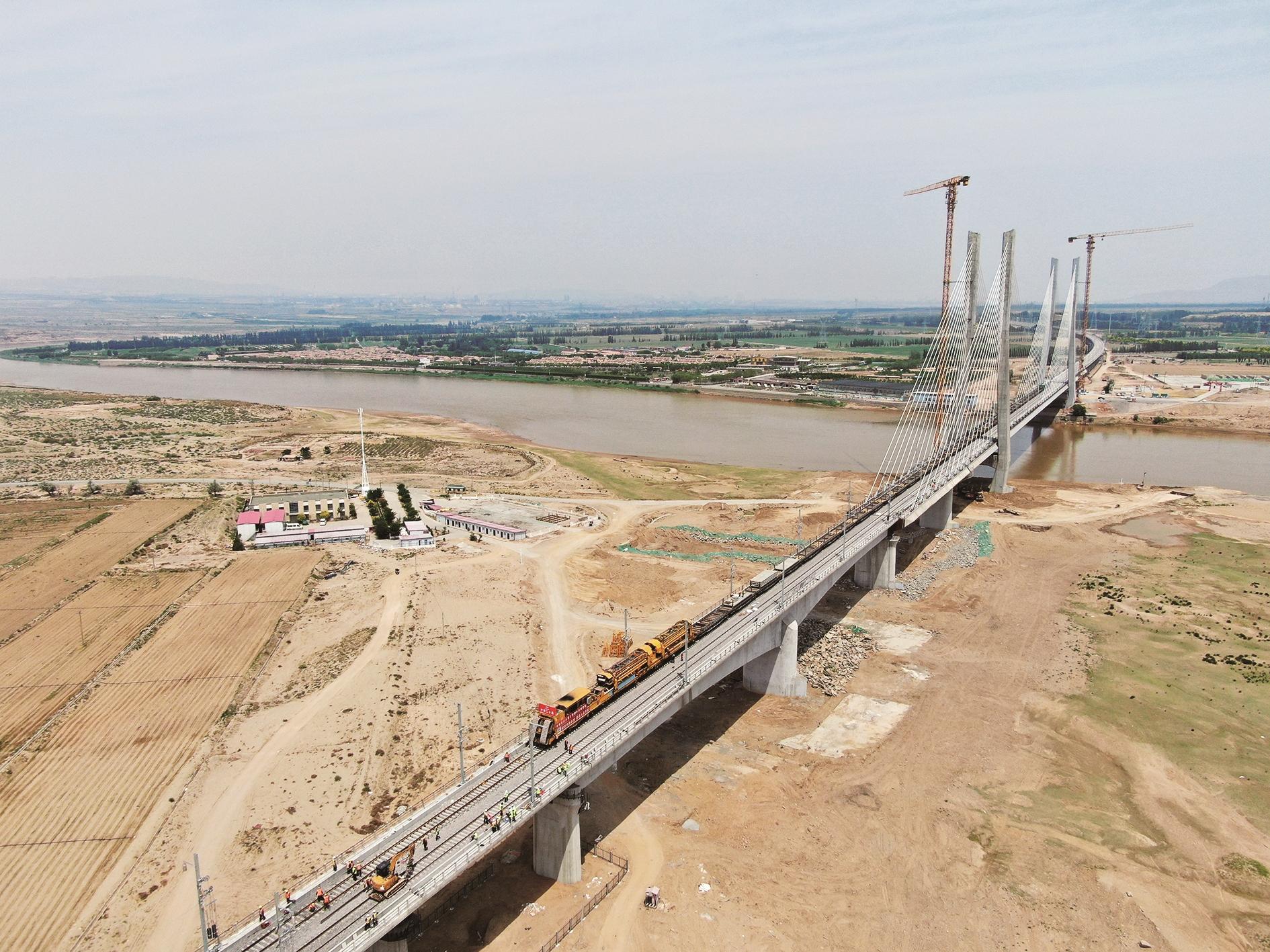 包银高铁乌海黄河特大桥铺轨现场(无人机照片)。(黄建飞 摄)