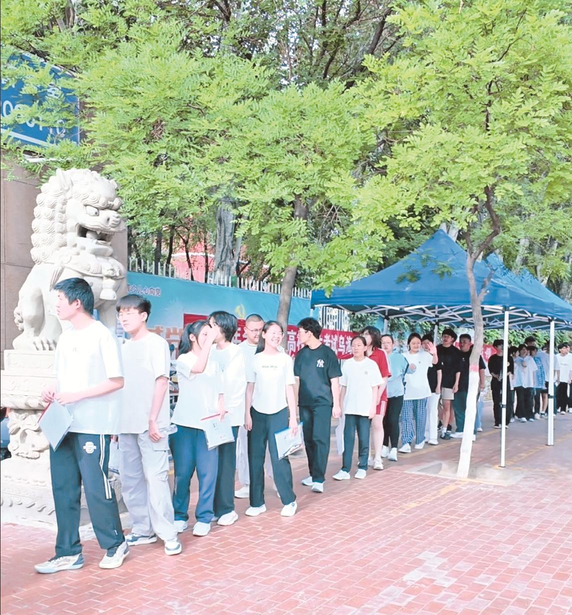 在乌达区实验中学考点,开考前,身着寓意吉祥红色半袖的市第十中学教师们早早到达考场外等候。“冯老师!”看到市第十中学教师冯雁婷,学生便情不自禁地涌向了她。