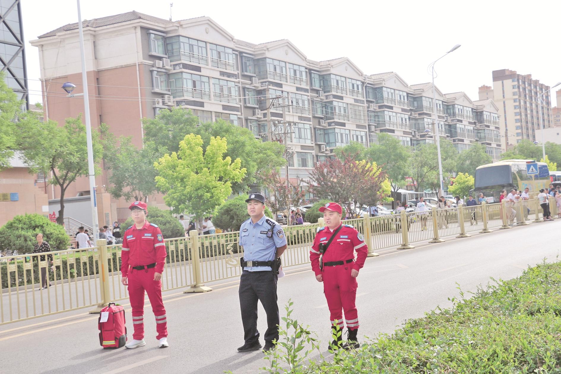 高考首日早上7时许,市公安机关安保民警辅警按照工作方案到岗,在考点周围学校执勤区域实行交通管制,对各重要路口、路段以及考点附近易拥堵路段采取交通分流措施。各考点均配备应急“铁骑”护考分队,随时准备提供紧急援助服务。