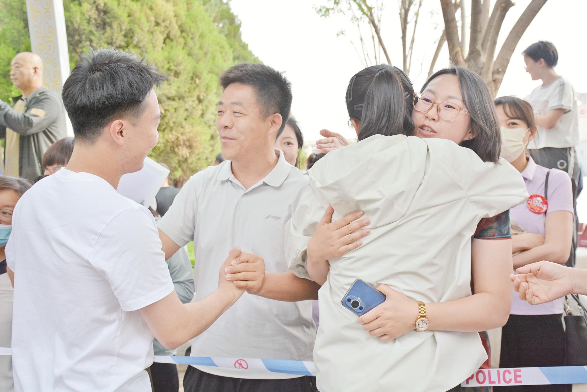 上午首场考试结束后,考生们有的飞奔向家长,有的与好友热烈拥抱,有的急匆匆跑到老师身前。