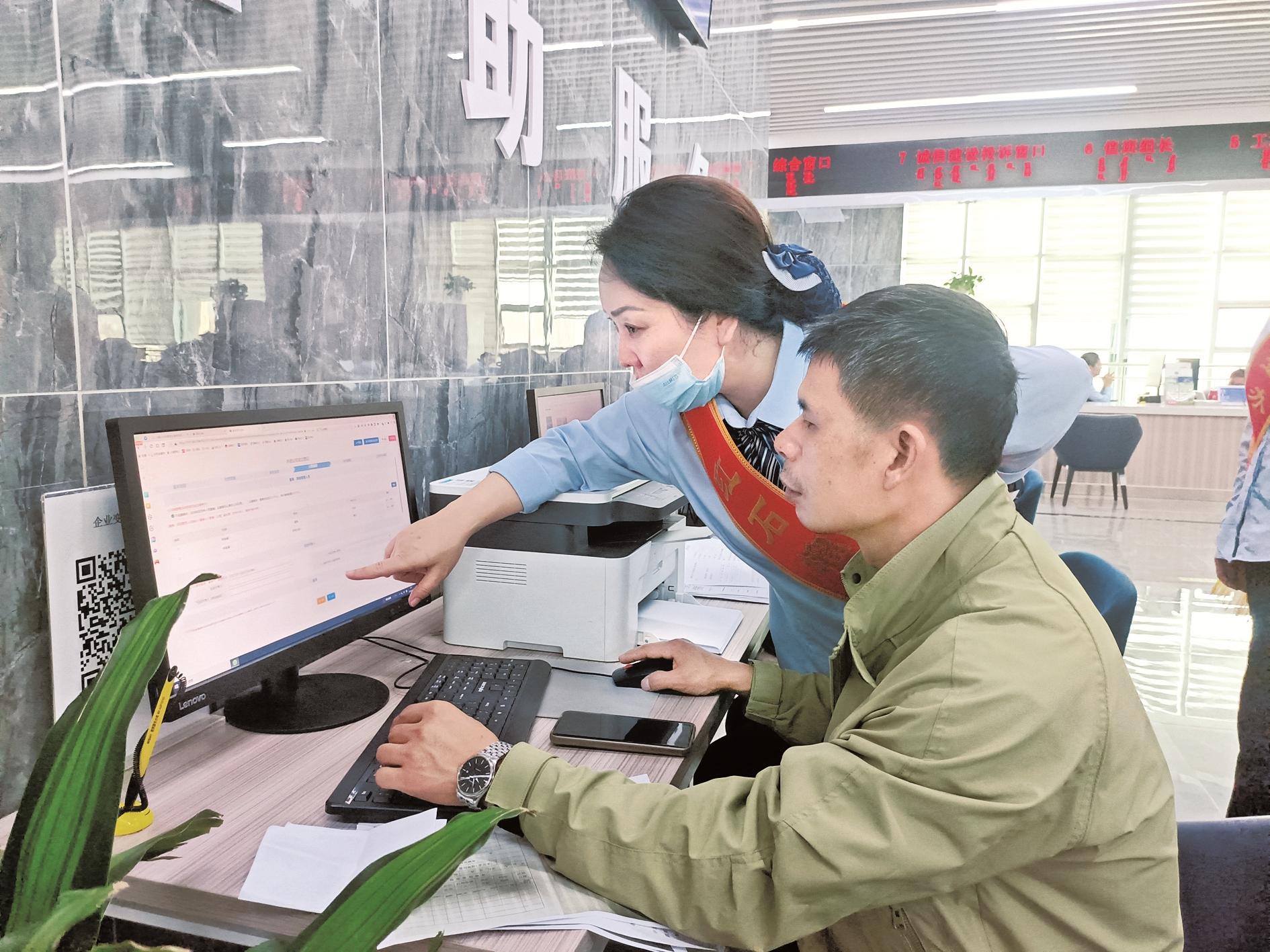 近年来,海勃湾区政务服务与数据管理局组建“红石榴帮办团”,为前来政务服务大厅办事的群众提供全程业务指导、表单填报、问题协调等服务,实施全程精准、零距离的“肩并肩”帮办代办服务。(刘春霞 摄)