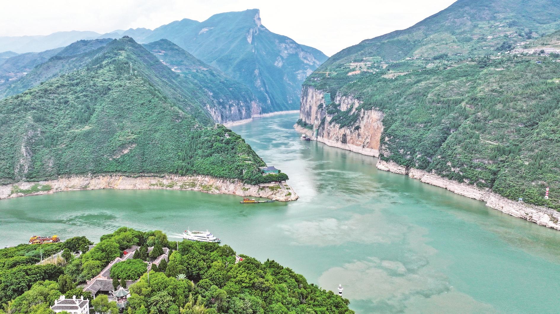 这是6月9日拍摄的瞿塘峡一带景色(无人机照片)。夏日,长江瞿塘峡一带风光旖旎,美如画卷。瞿塘峡西起重庆市奉节县白帝城,东至巫山县大溪乡,以雄奇、险峻著称。 新华社记者 王全超 摄