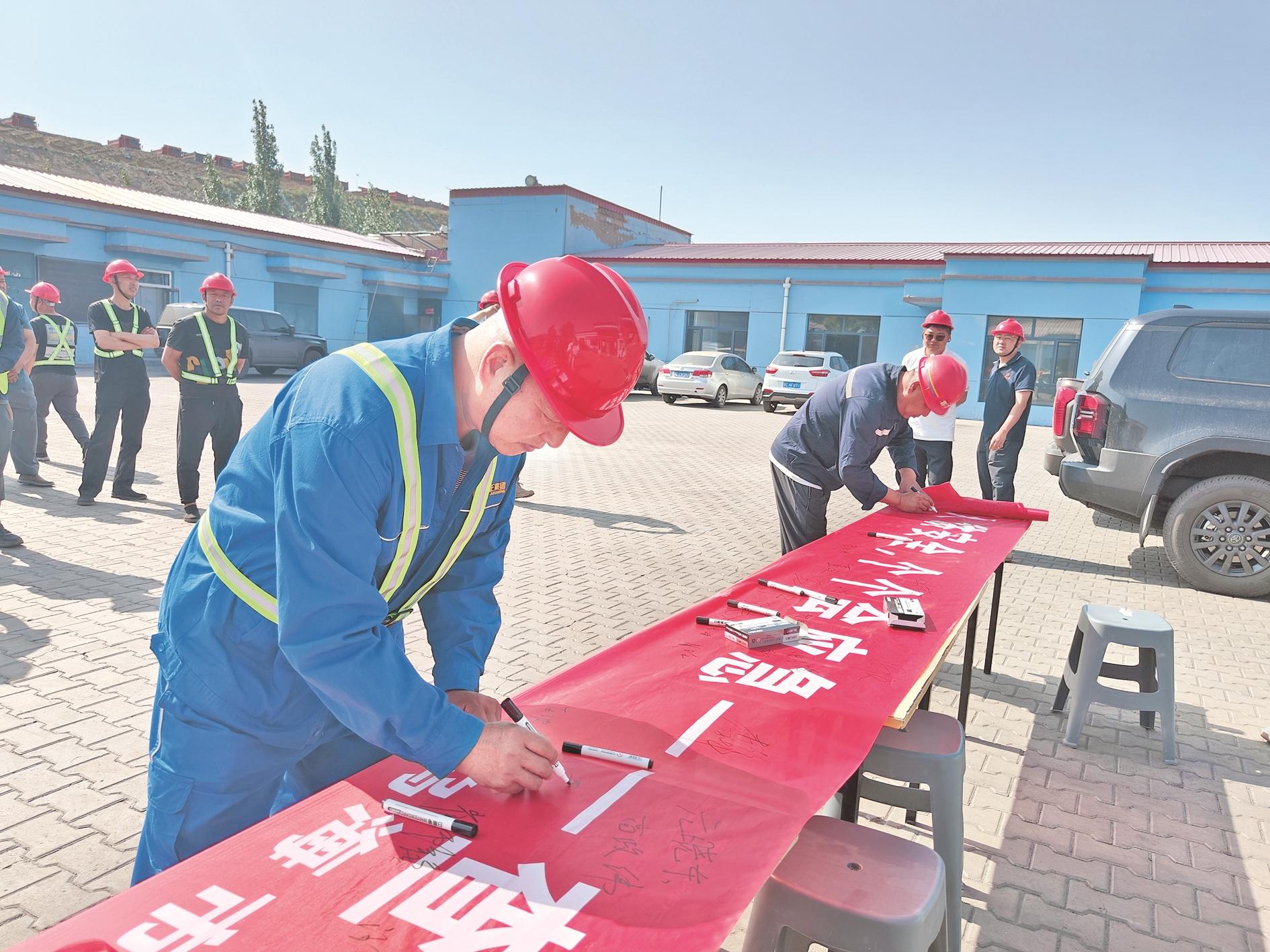 近日,海勃湾区应急管理局开展了2025年安全生产月“人人讲安全,个个会应急——查找身边安全隐患”主题行动。图为乌海市金和泰煤业集团恒实煤矿有限公司职工签署安全生产责任状。 (毕晓敏 摄)