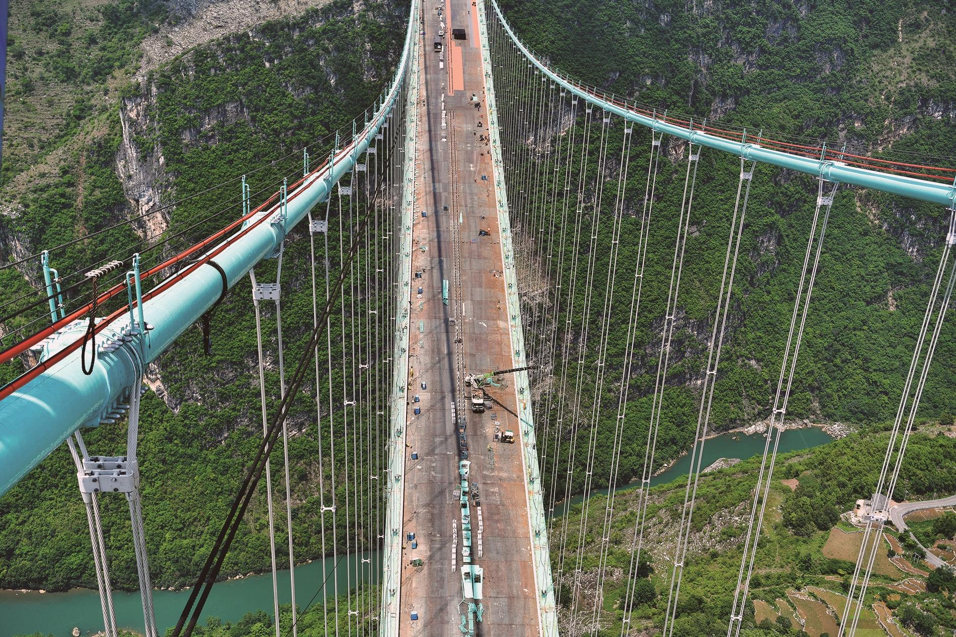 截至目前,大桥主桥下构、引桥、索鞍、主缆、索夹、吊索、钢桁梁、桥面板、主缆缠丝、主缆防护及主缆检修道已施工完毕,正在进行护栏安装、桥面铺装及观光电梯施工。