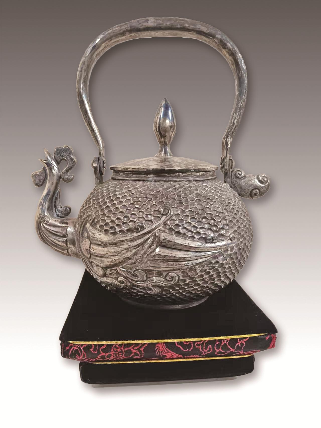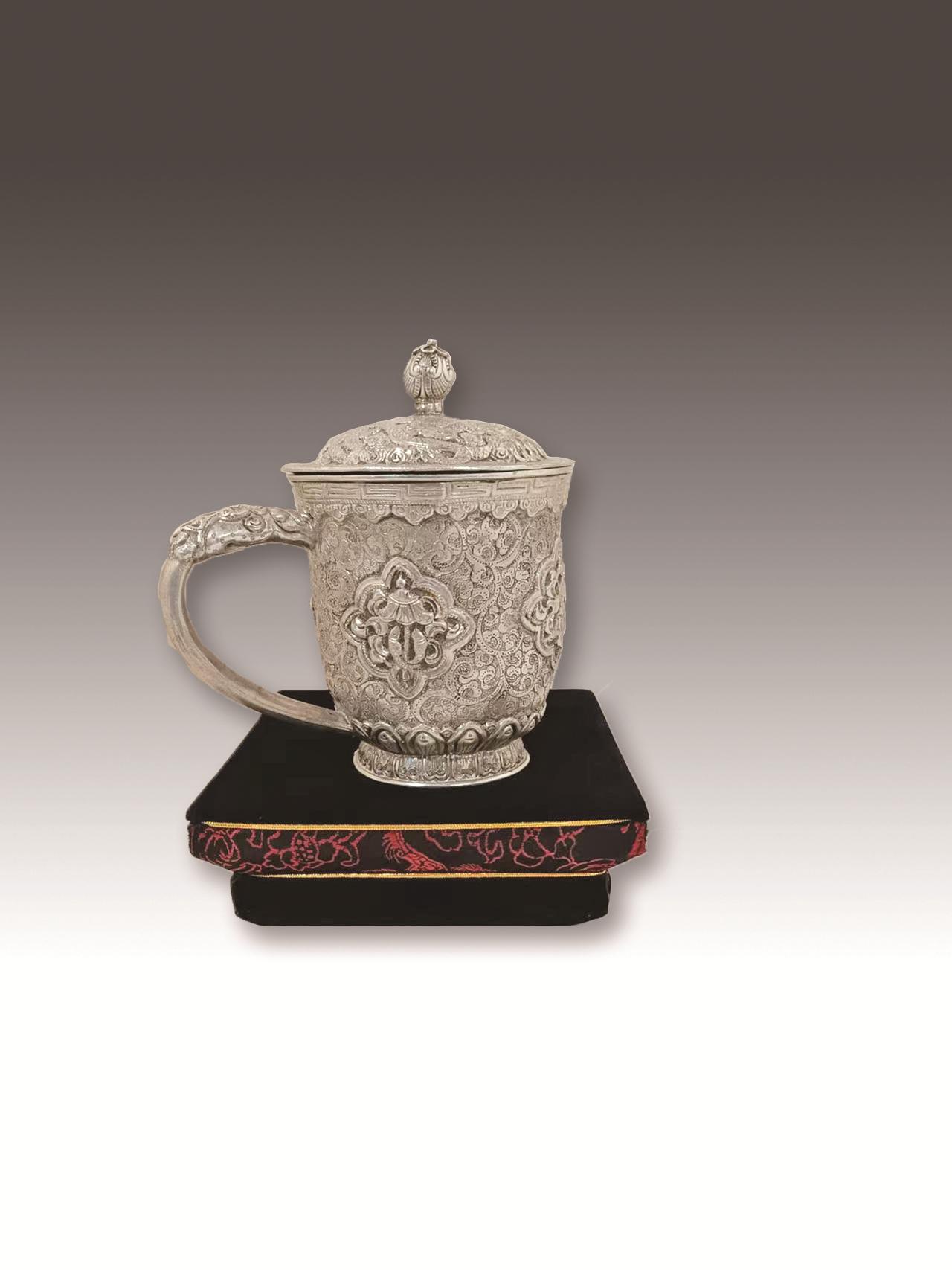 推开贾文彪工作室的大门,古朴的气息扑面而来。工作台前,贾文彪双手正握着小锤,叮叮当当有节奏地锻打着泛着光泽的银料。淬火后的银料在他手中一点一点延展开来,仿佛被赋予了生命。工作台上的錾钉、喷枪、钳子等近百种工具整齐排列,每一件都被岁月打磨得锃亮,“制作金银器是项慢功夫。”贾文彪边说边干,小锤起落间,银板被逐渐打磨成薄片。他拿起自制的模具,将银片细心敲打塑形。“一个茶碗,从银条到成品,至少得四天。”四天的时间里,每一次敲打、每一次雕琢,都倾注了贾文彪无尽的心血。