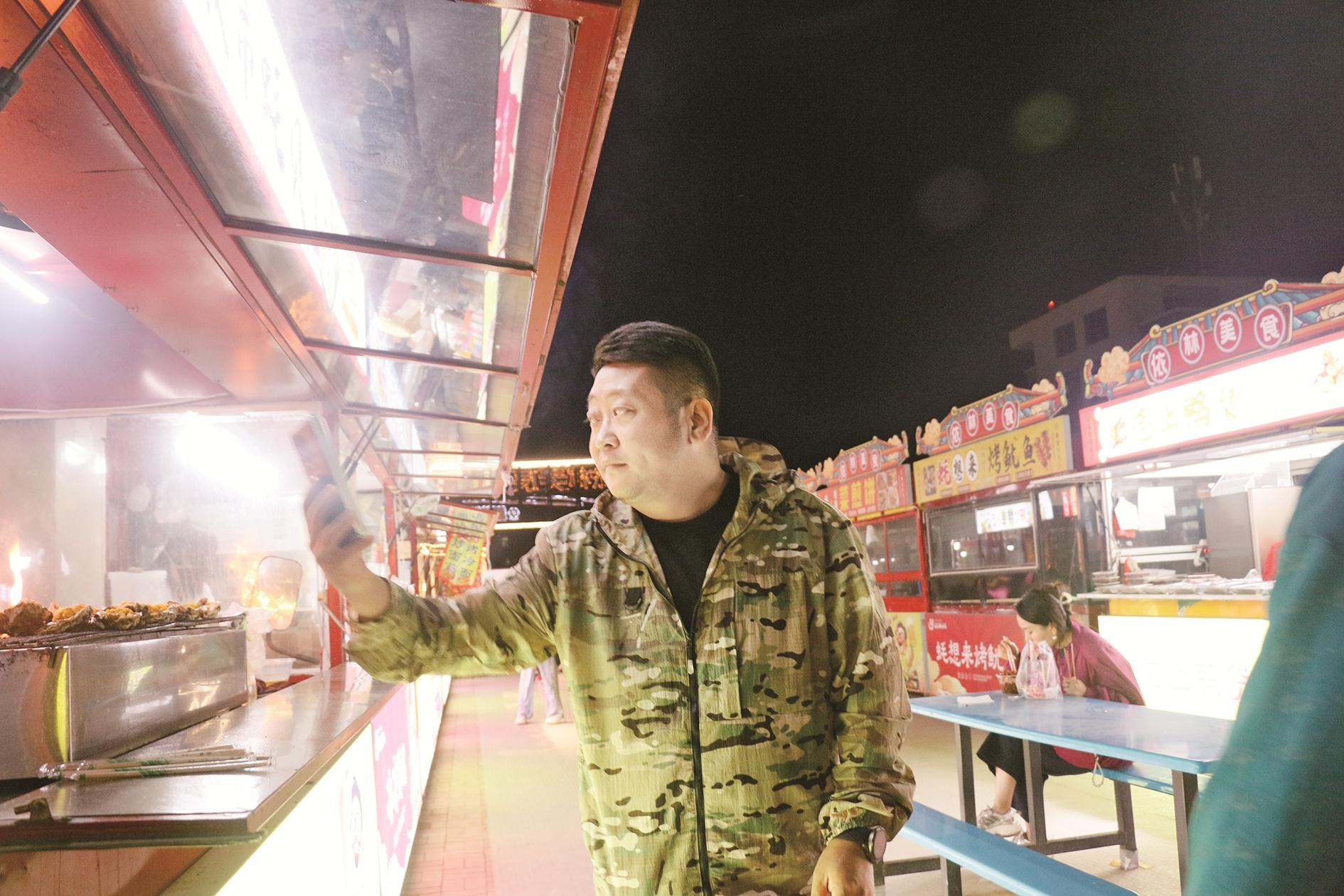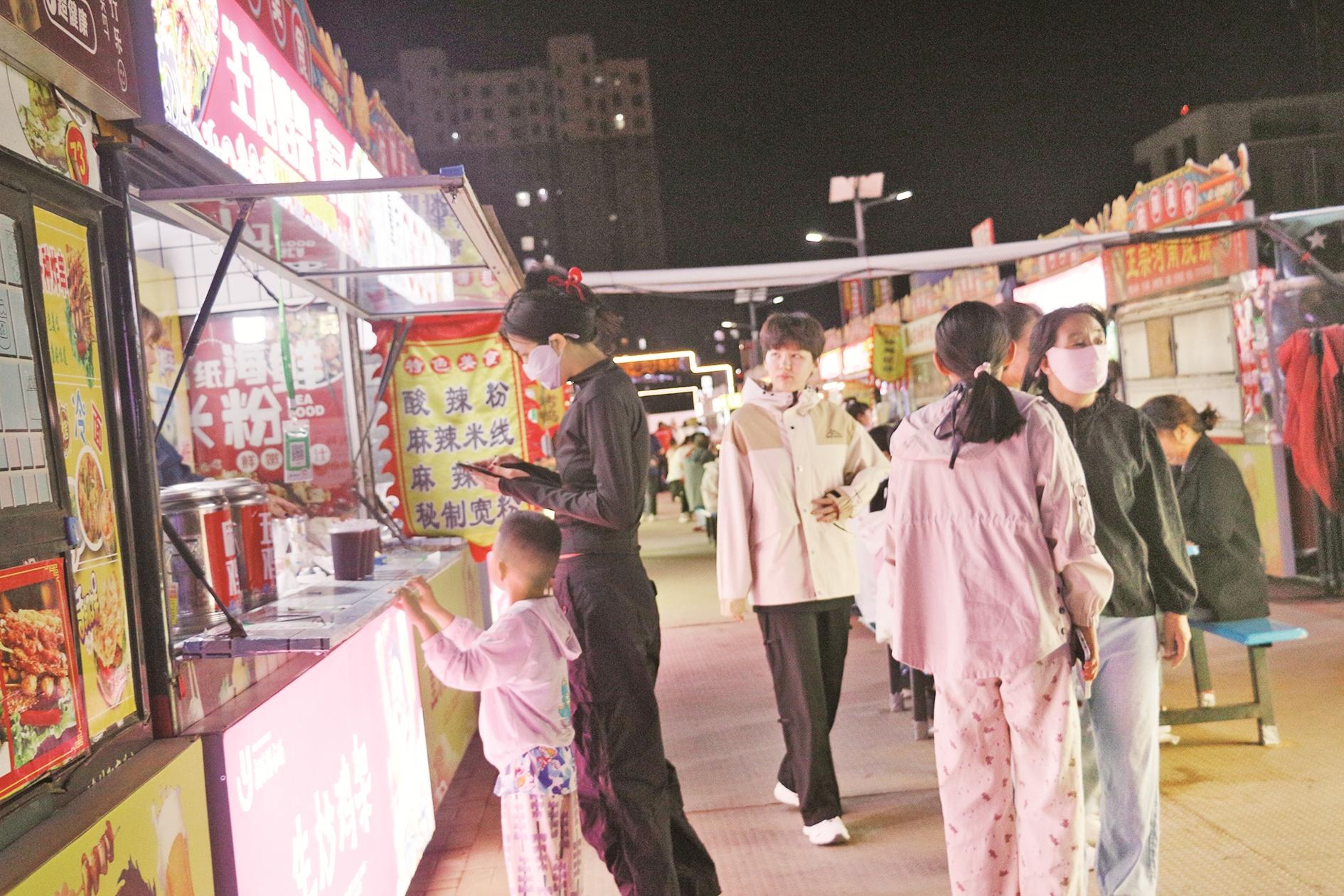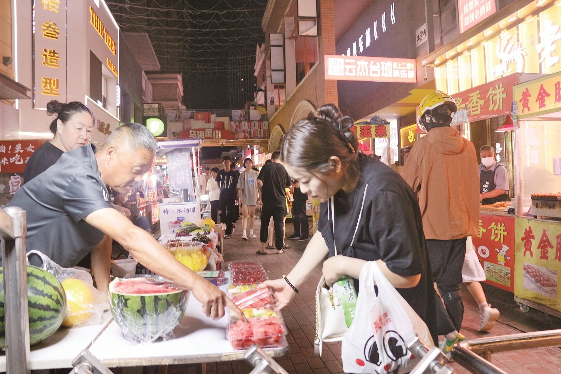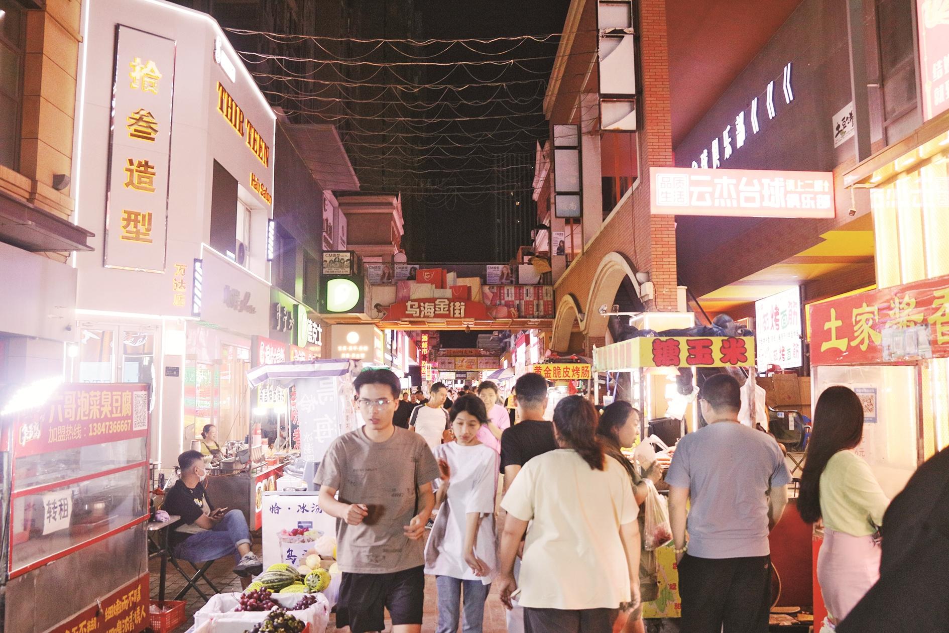 在海勃湾区万达金街巷内,同样灯火璀璨,汇聚购物、娱乐、休闲等丰富消费场景,成为市民休闲娱乐的好去处。一处烧烤摊上,左侧粉红色的肉串鲜嫩欲滴,右侧棕色的肉串散发着诱人的香气,烤架上方的白色横杆上,小孔中透出丝丝光亮,烧烤摊主一边大声吆喝,一边上下快速翻动着肉串。鲜花摊位上,卖花摊主细心地整理着每一束花,将它们摆放得整整齐齐。从传统夜市到现代商圈,我市以璀璨灯火点燃夜经济,让夜晚“亮”起来、人气“聚”起来、消费“活”起来。