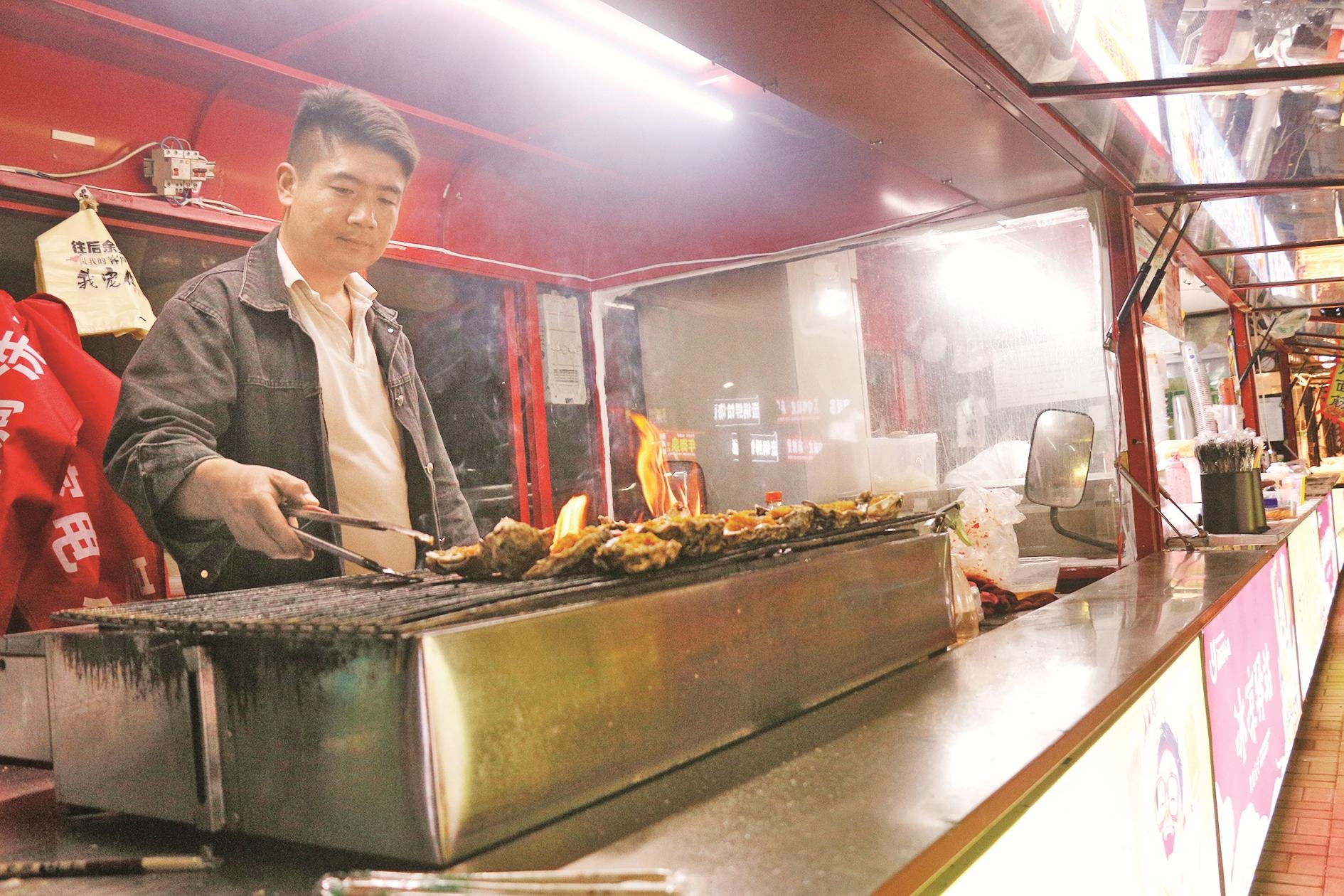 烧烤摊主炭火翻烤。