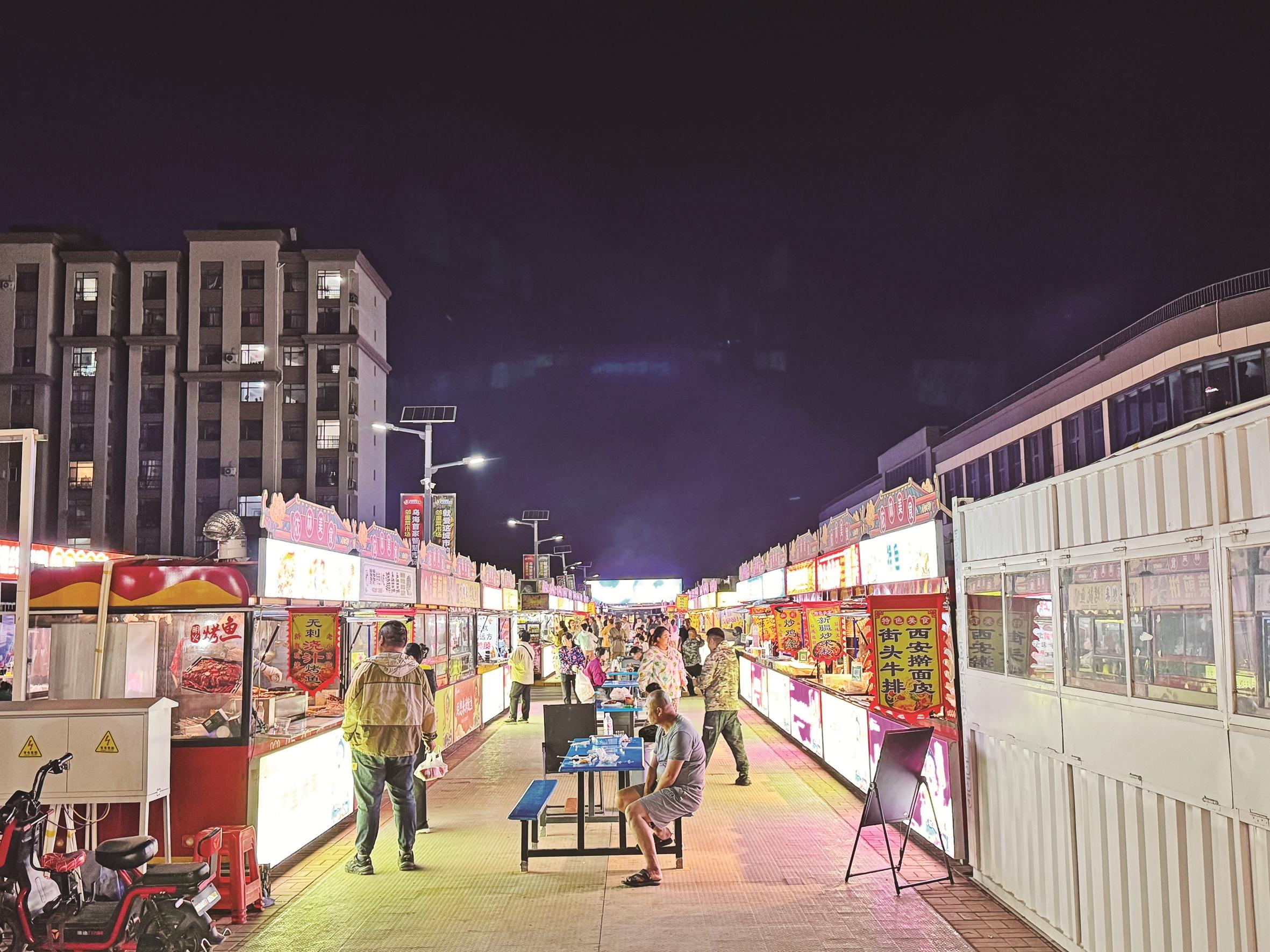暮色四合,华灯初上。海勃湾区依林美食市集夜市陆续“开摊”,商家的霓虹招牌亮起,摊主笑意盈盈地准备美味,摊位烟火缭绕、香飘四溢,桌凳围坐着共享美食的人。美食香气与车流、人流相织交会。