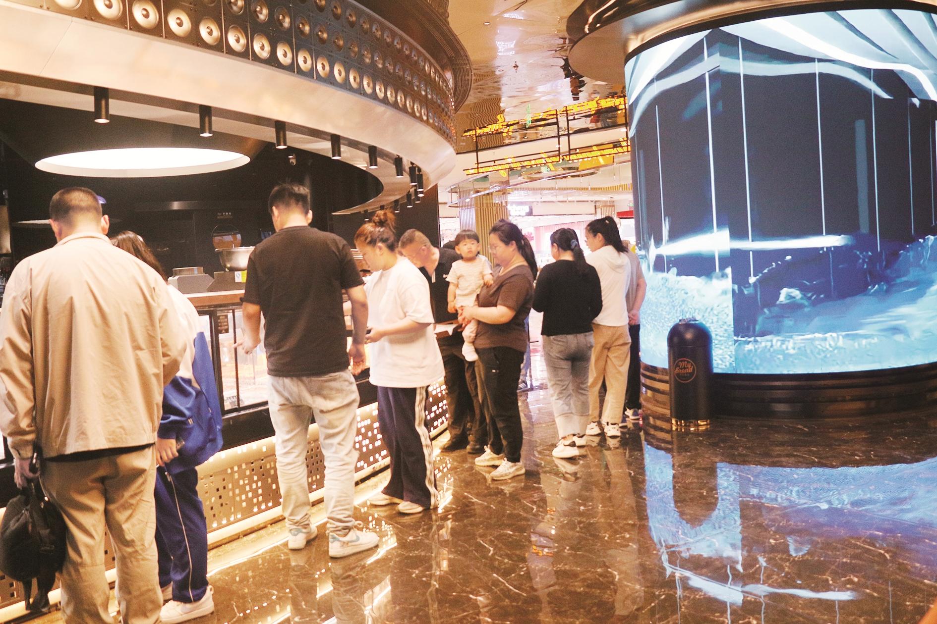 顾客在面包店内挑选面包。