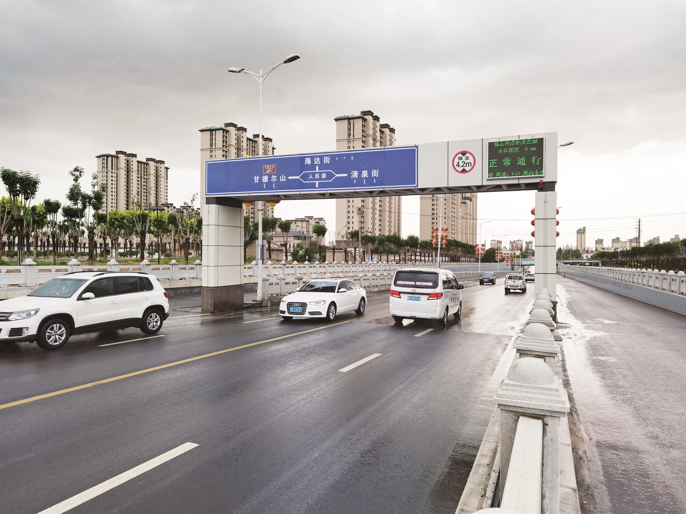 路面好“走”了,桥洞这种以往问题严重的地段也有了新的变化。在位于乌海万达广场南附近的万和桥记者看到,桥的东西两侧各有一块LED显示屏,上面不仅显示着桥下的水位深度,还有当天的温度、湿度等信息,且清楚地标注了是否能正常通行,来往车辆远远地就能看到。