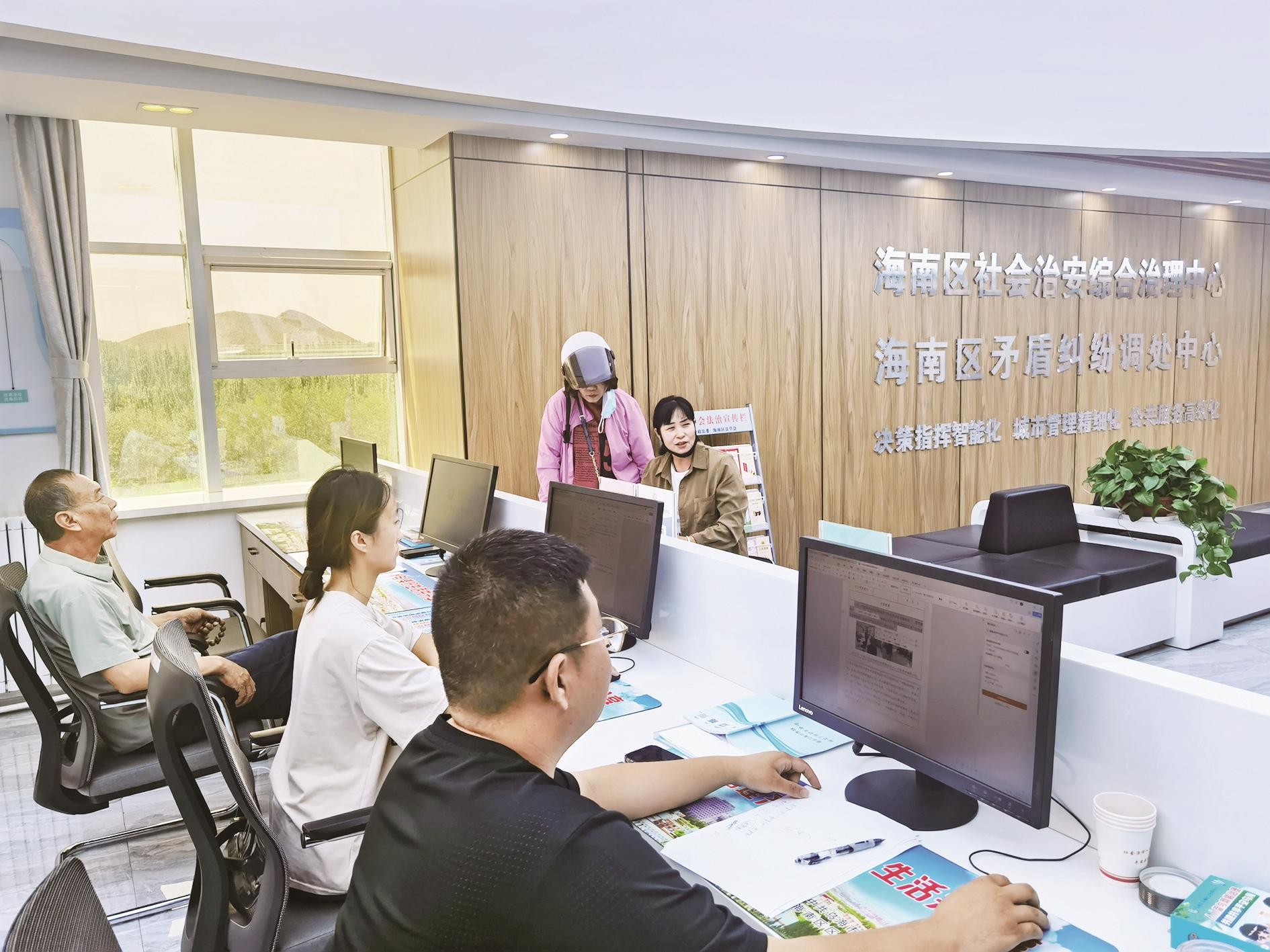 海南区综治中心主任史瑞霞介绍道:“我们始终坚守矛盾纠纷‘只进一扇门、最多跑一地’的目标,优化资源配置,依照矛盾纠纷化解法治化‘路线图’,重新规划接待窗口。构建起‘引导受理区+多元化解区+指挥调度区’的工作格局,形成‘3+5+2’(3个功能区+5步闭环流程+2项智能保障)工作模式。全面规范群众诉求登记、受理、交办、督办、回访等全流程,搭建起矛盾纠纷预防化解和社会治安风险防控的‘一站式’平台。”
