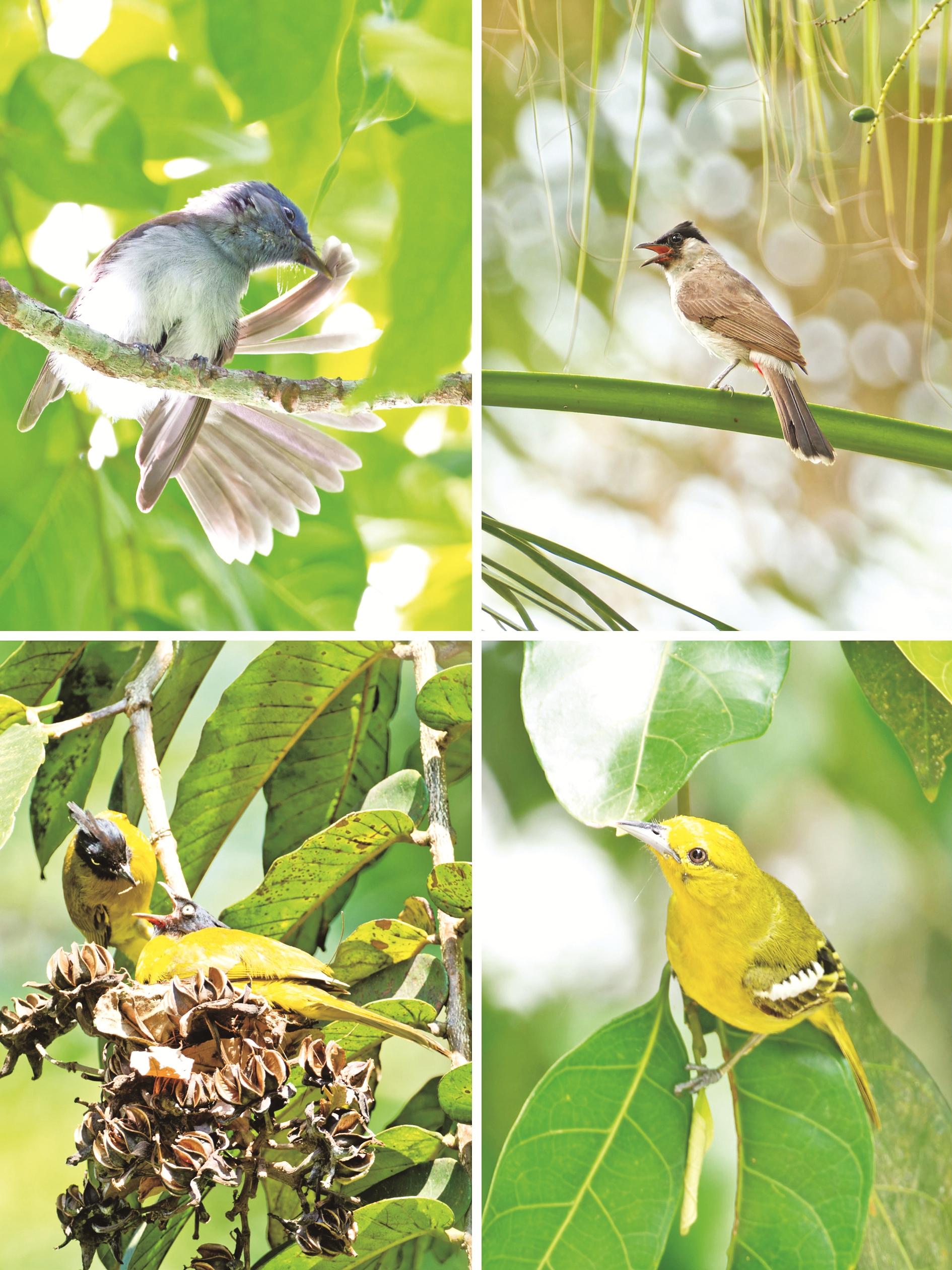 ▲拼版照片:左上为黑枕王鹟;右上为白喉红臀鹎;左下为黑冠黄鹎;右下为黑翅雀鹎(6月15日摄于中国科学院西双版纳热带植物园)。