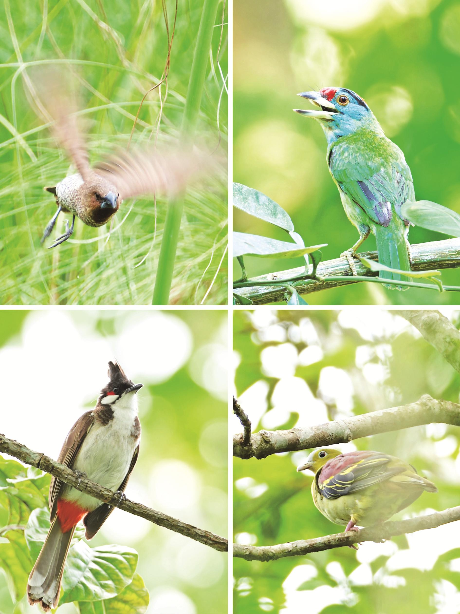 ▲拼版照片:左上为斑文鸟;右上为蓝喉拟啄木鸟;左下为红耳鹎;右下为灰头绿鸠(6月15日摄于中国科学院西双版纳热带植物园)。