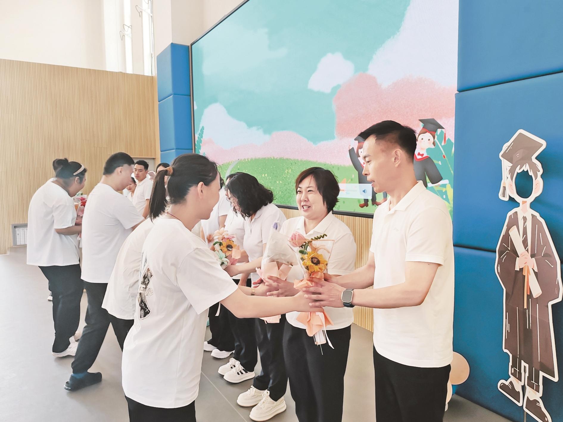 “看着老师们精心剪辑的视频,我真的很感动,这些视频记录了我孩子的成长。我的孩子因基因突变导致智力低下,大运动发展落后,手部肌肉力量不足,他上四年级的时候来到市特殊教育学校,在这里他进步非常大。刚入学时,班主任老师找我了解了孩子的能力发展情况,为他专门制订了有针对性的训练计划。经过五年的努力,我的孩子走路几乎看不出问题,能跑能跳。听指令的能力也增强了,还能主动与人交流。转眼我的孩子19岁了,即将毕业要离开校园,这个典礼让我们家长特别感动,希望我的孩子离开校园后还能这么快乐、充实地生活下去。”学生朵朵的家长说。