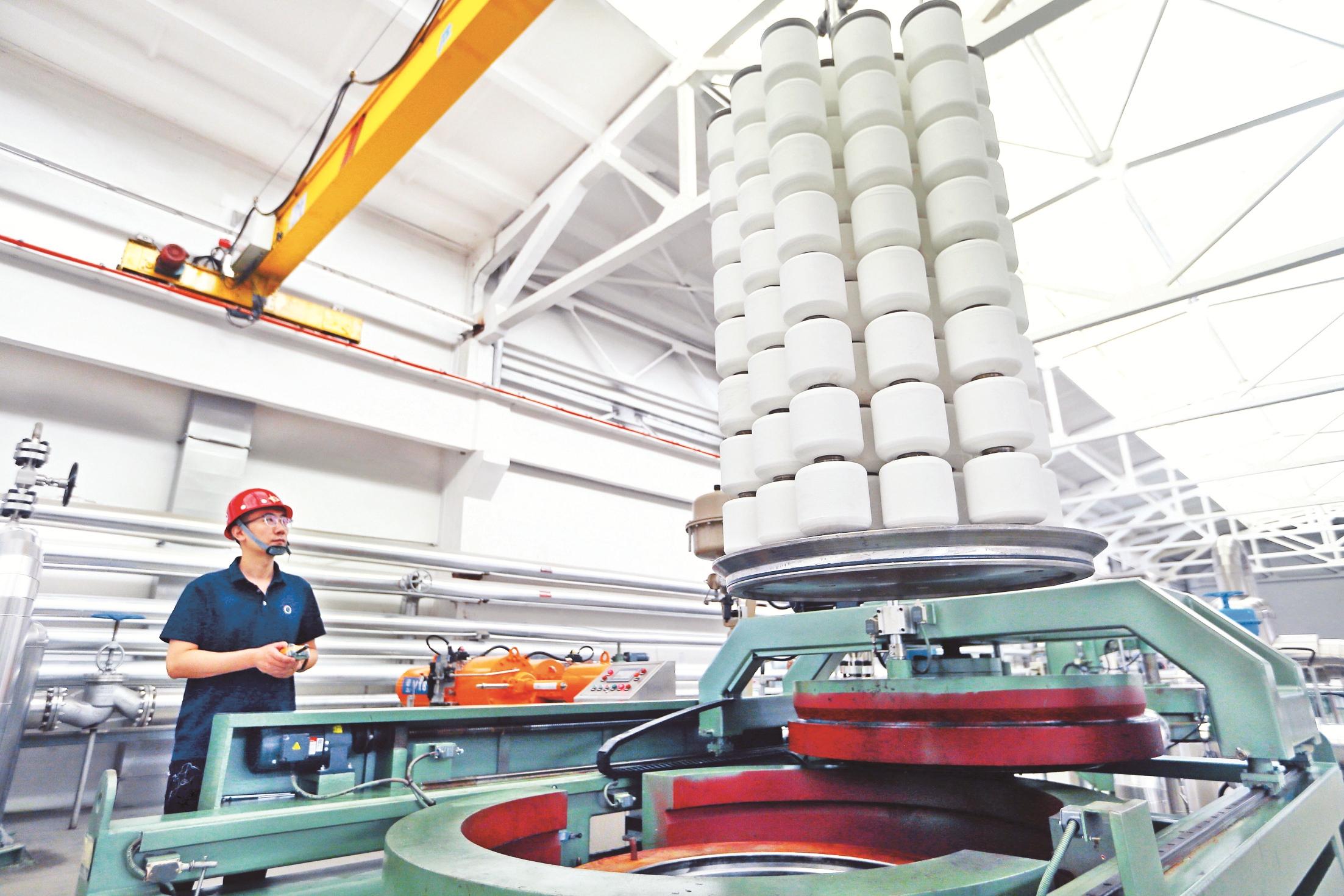2025年6月20日,在青岛市即墨区即发集团股份有限公司超临界二氧化碳无水染色生产线上,工人将一批待染的聚酯纤维筒子纱装入染缸。 新华社发 (梁孝鹏 摄)
