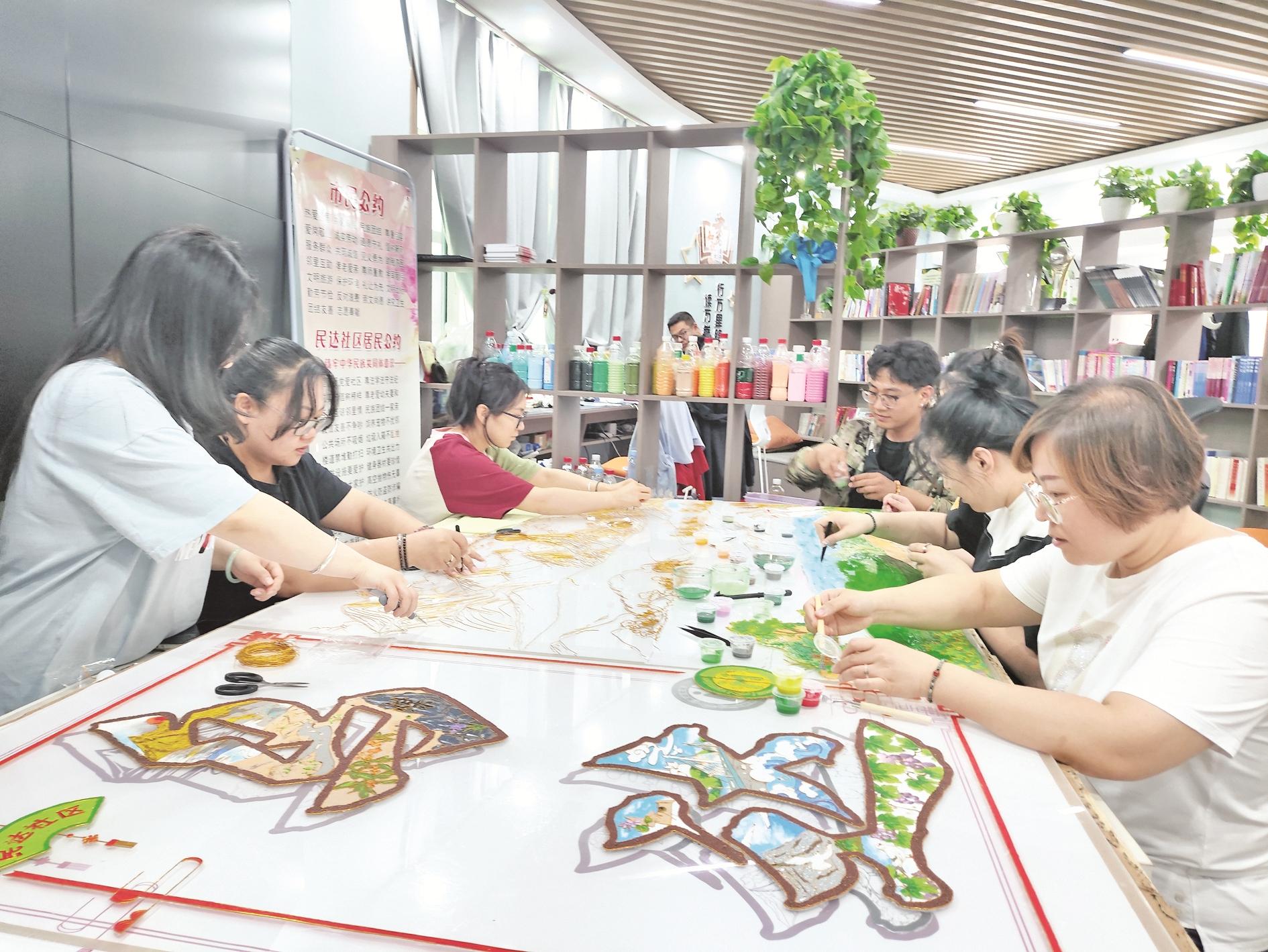 近日,乌达区梁家沟街道民达社区工作人员通过走访群众,了解到居民心中的家园形象后,组织热爱非遗文化的居民、志愿者共同制作掐丝珐琅作品。这些作品展现了民达社区居民眼中乌达区的发展和变迁。 (张丽阳 摄)