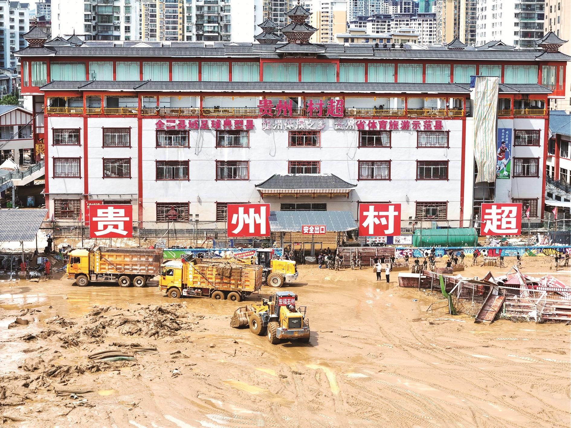 6月25日,大型设备在贵州省榕江县“村超”球场清淤(无人机照片)。受持续强降雨及上游来水叠加影响,6月24日,都柳江贵州榕江、从江段遭遇特大洪水,灾情严峻。新华社发 龙建睿 摄