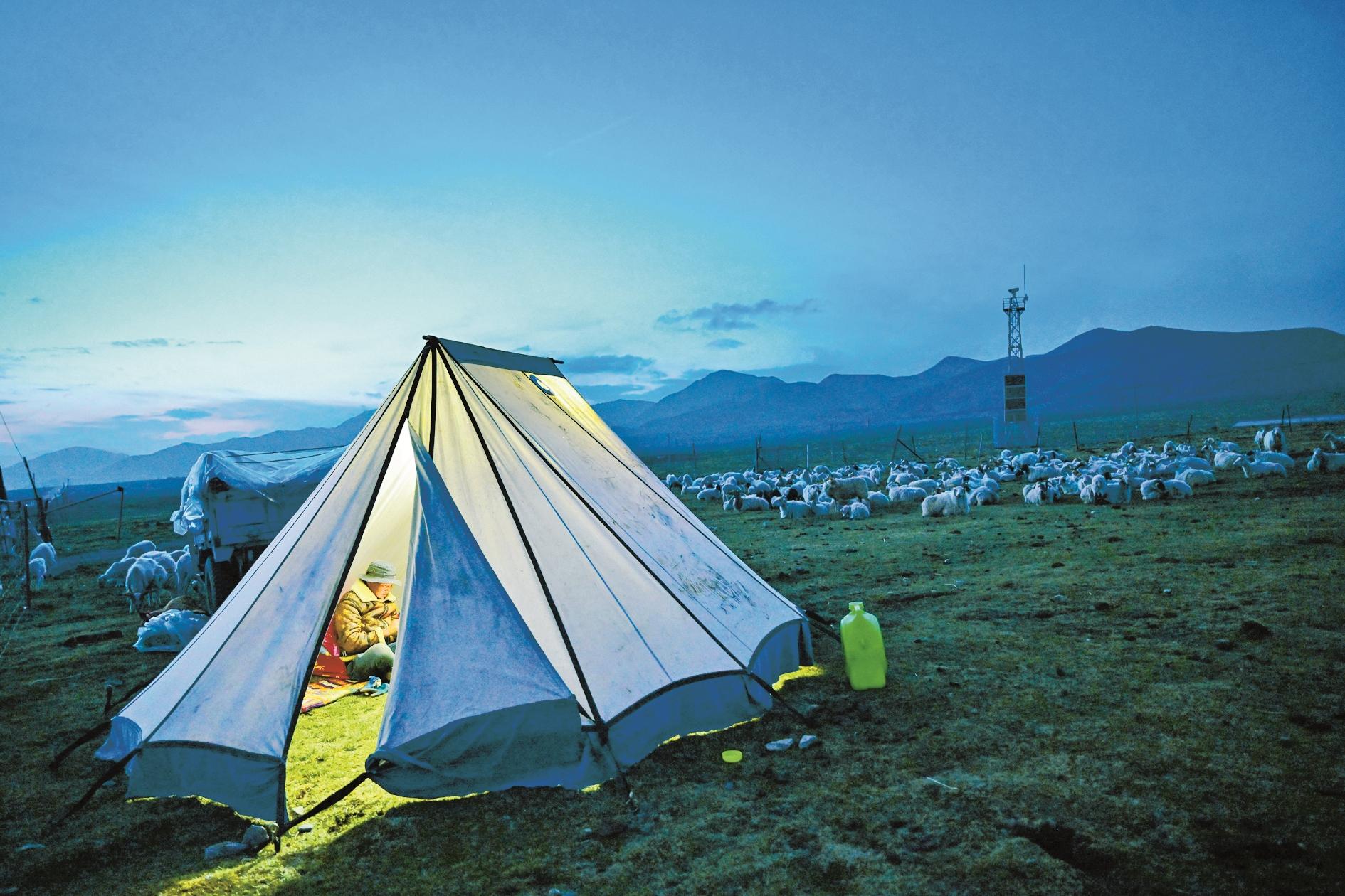 6月25日夜间,牧民先巴尖措在帐篷内休息。盛夏时节,祁连草原绿茵如毯。在青海省海北藏族自治州祁连县,牧民们赶着牛羊,陆续从冬牧场出发,踏上数百里的迁徙之路。新华社记者 张龙 摄