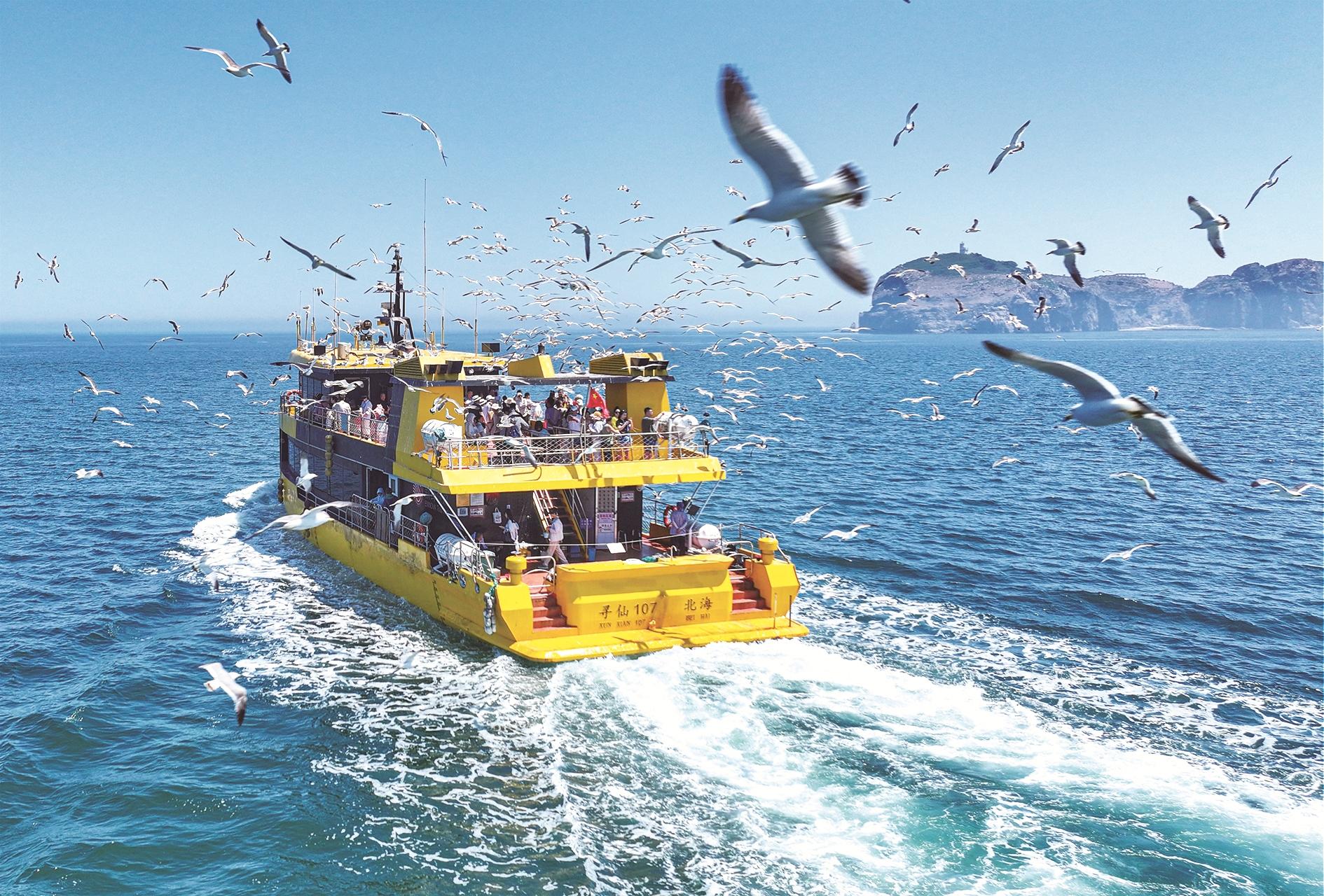6月23日,在山东省荣成市海驴岛海域,游客乘船游览时与黑尾鸥互动(无人机照片)。新华社发 李信君 摄